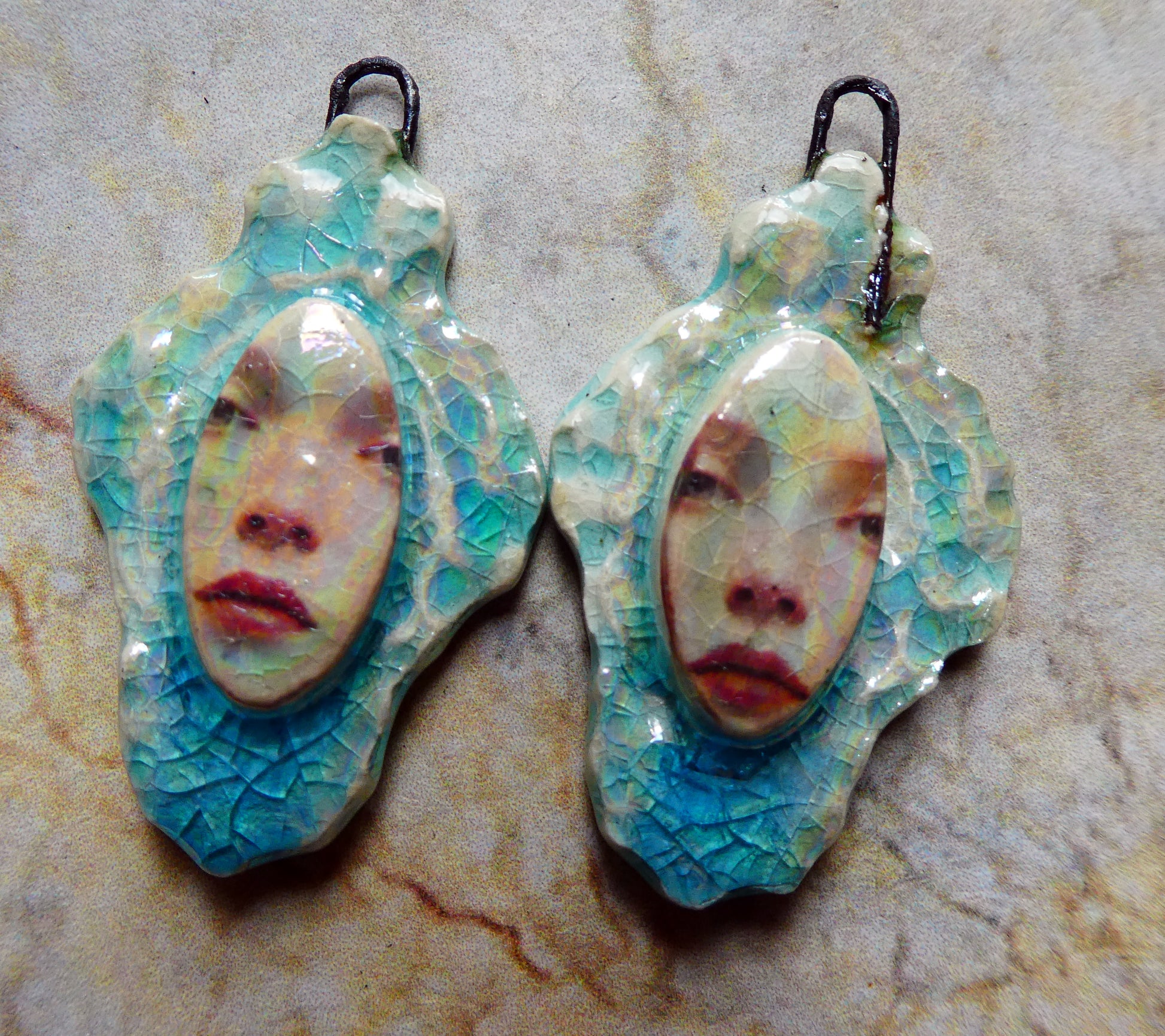 Hand formed in Earthstone and high fired. Then fired with Gloss and Aquamarine Crackle glaze. Applied with goddess face decals and fired again, and then a fourth time with Mother of Pearl lustre.