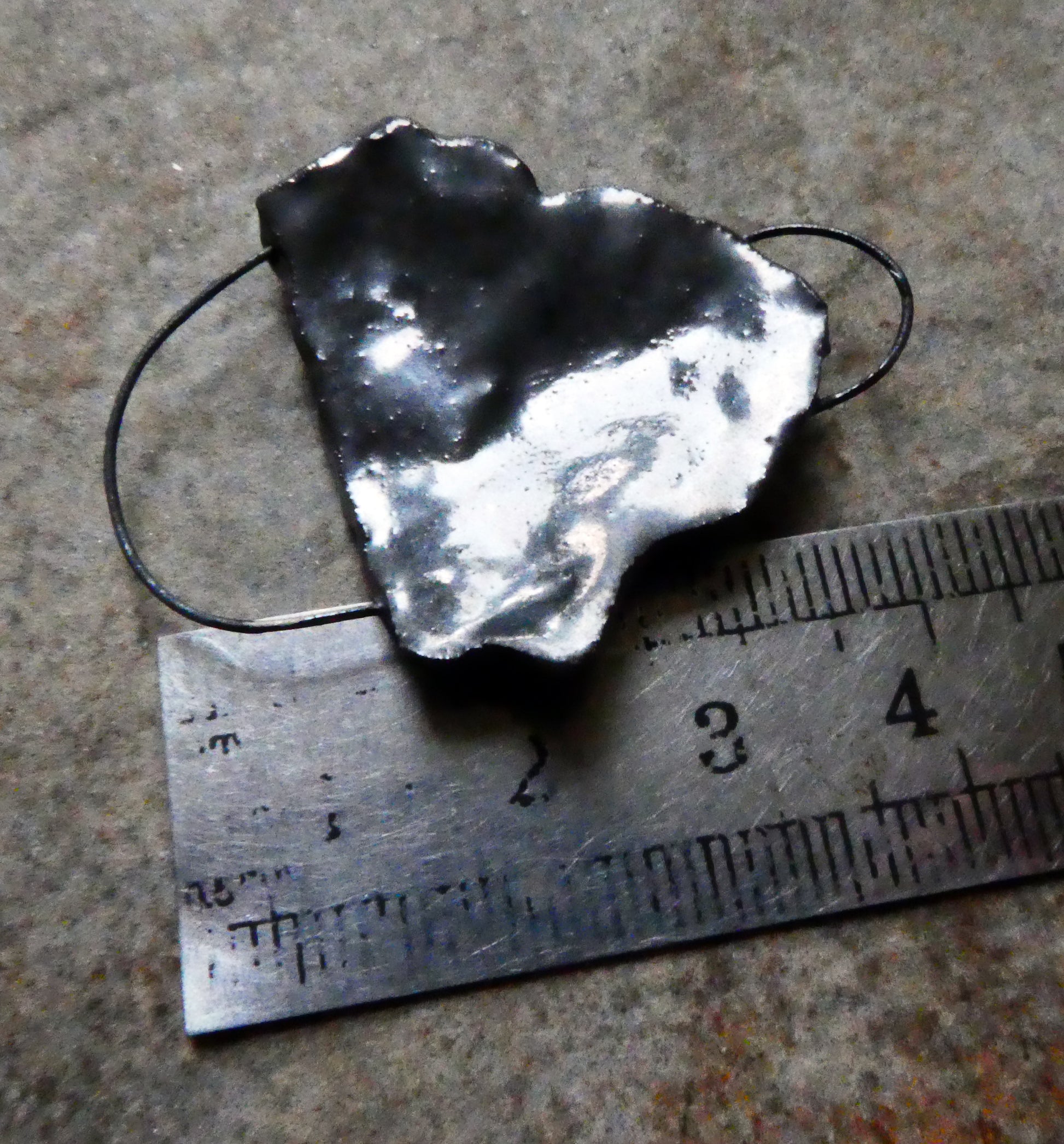 Hand formed in Earthstone and high fired. Fired again with Pewter glaze. With one big hoop for connections.