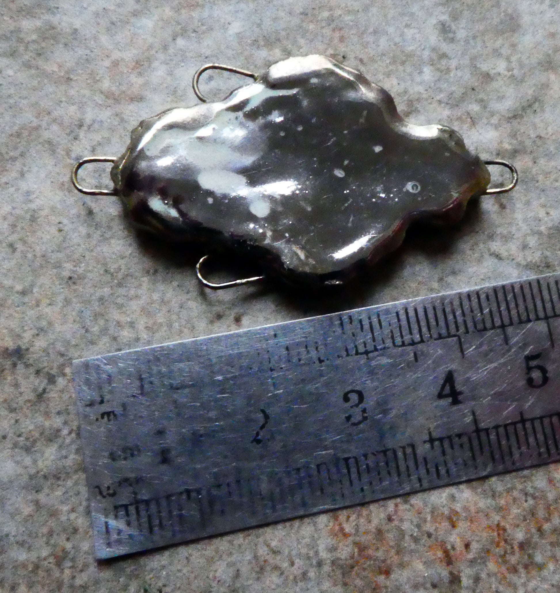 Hand formed in Earthstone and high fired. Then fired again with Gloss glaze and Bronze clay. Applied with Platinum Lustre, and fired once more. The lustre is rather shattered and aged on this one.