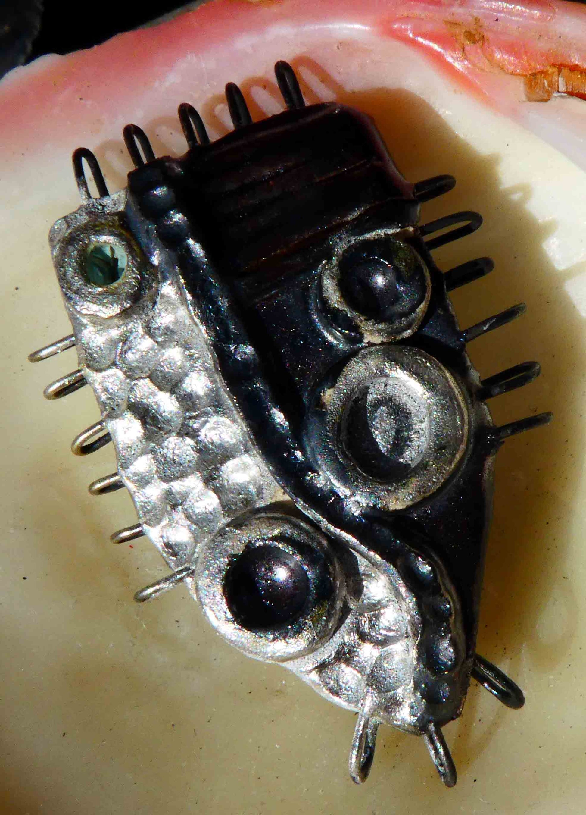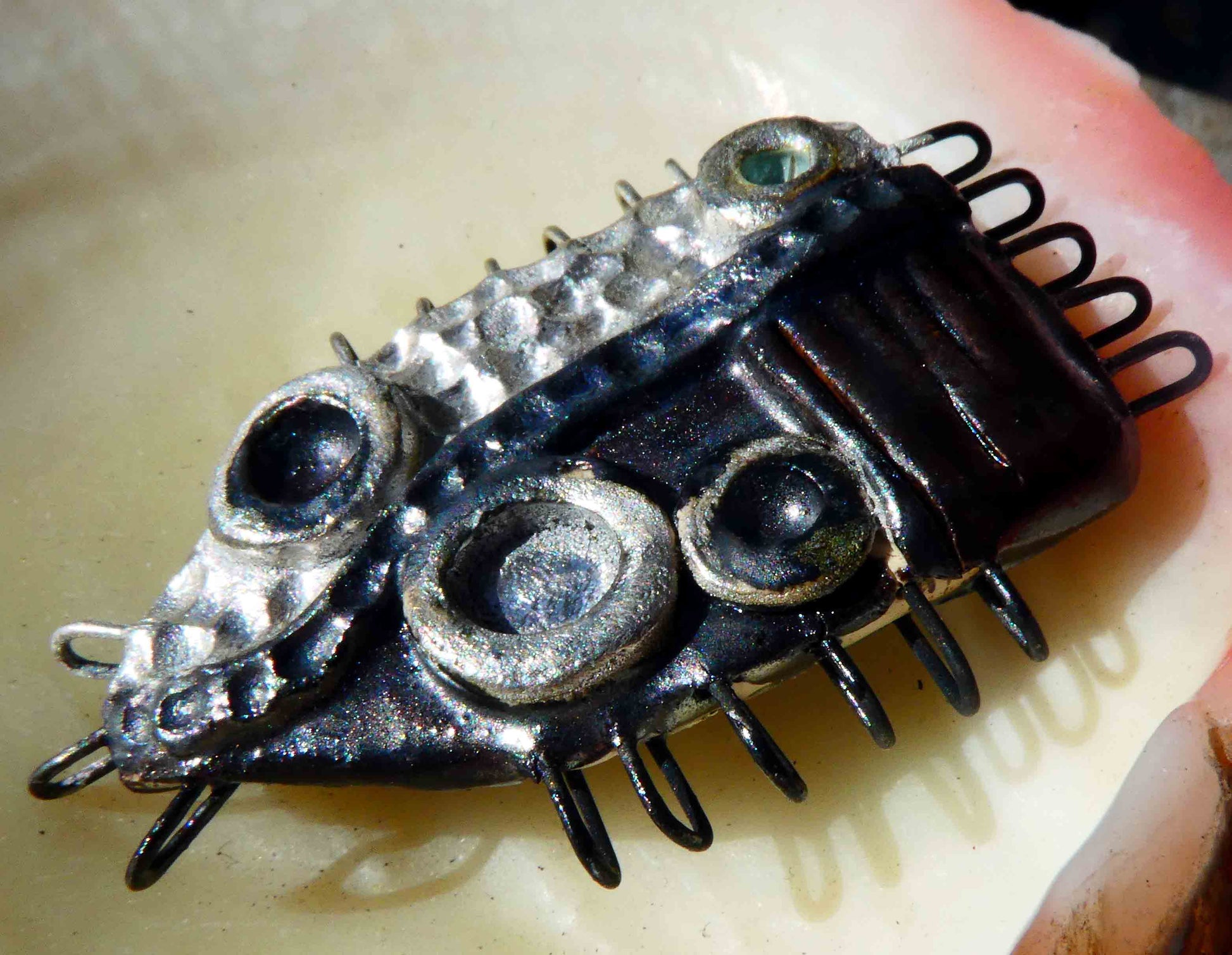 Hand formed in Earthstone and high fired. Then fired again with Bronze clay, Pewter, Reflecting, and Gloria glazes. Applied with Sterling Silver Clay, and fired again.