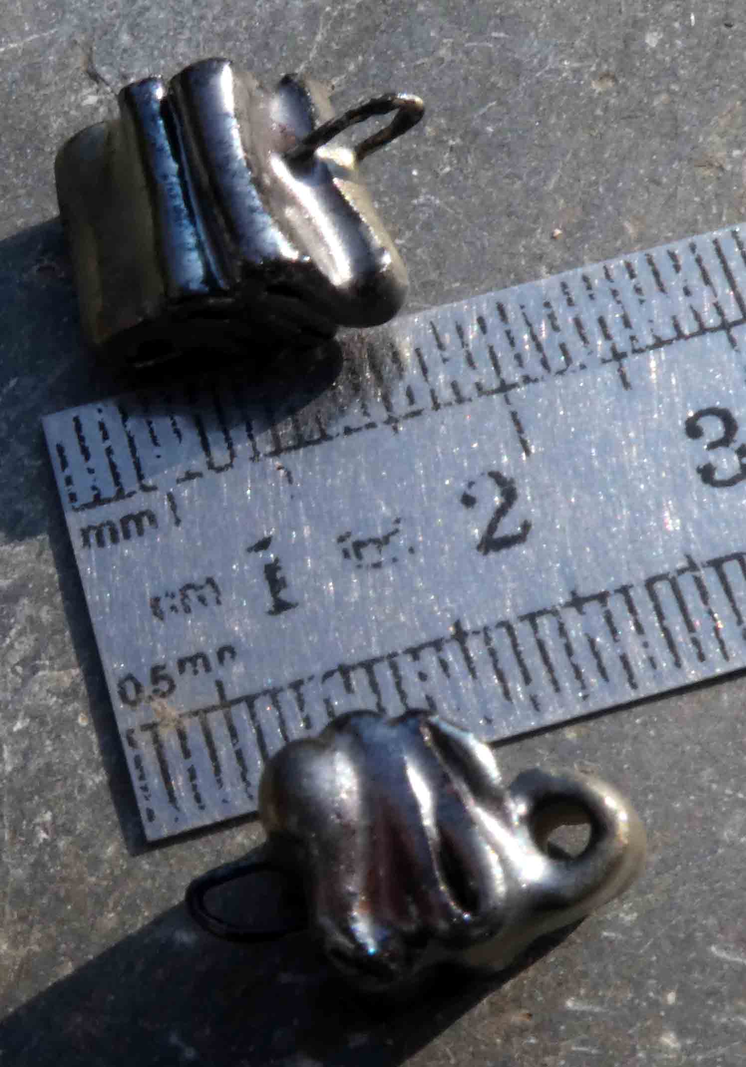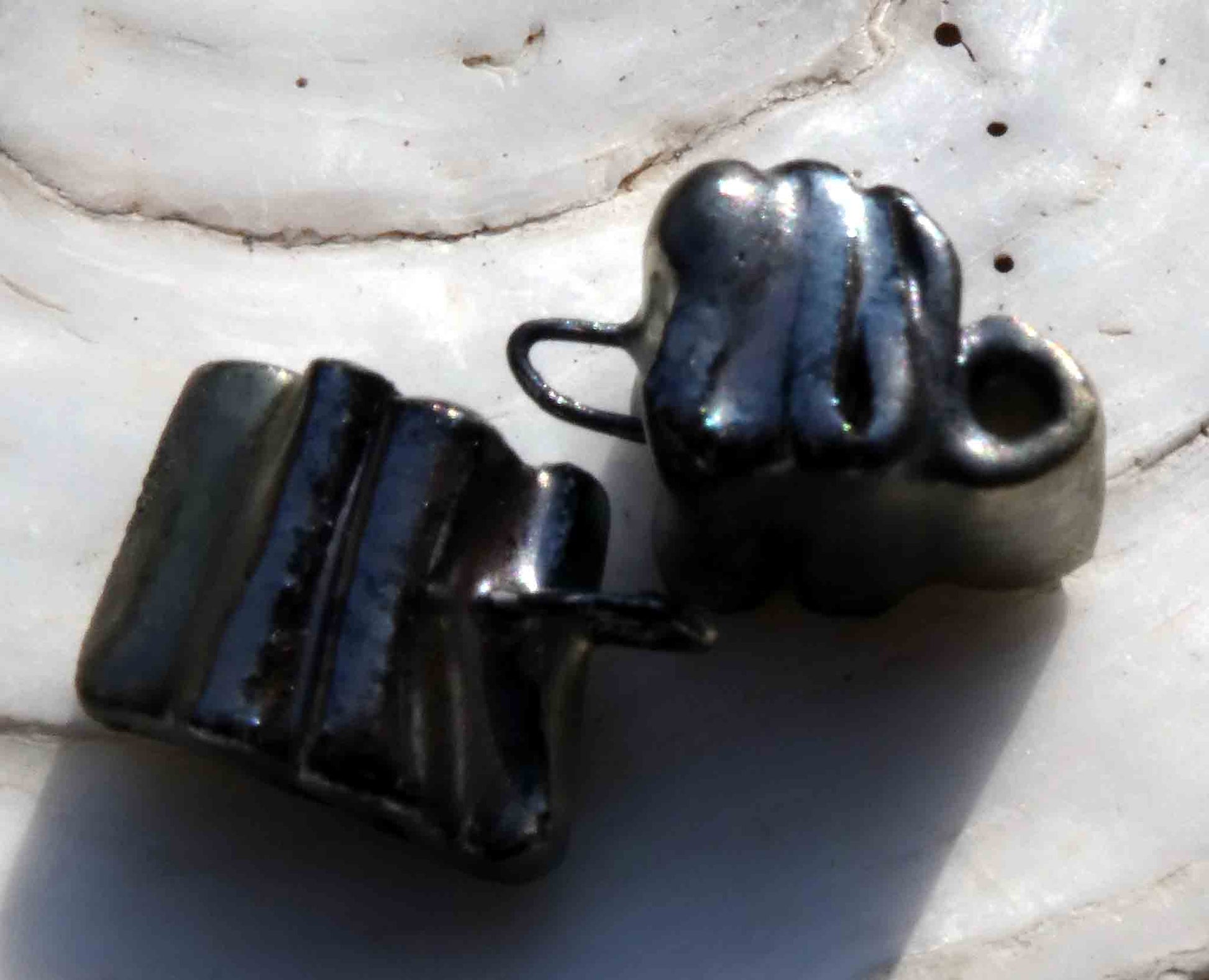 Hand formed in Earthstone and high fired. Then fired again with bronze clay and Gloria glaze. The bottom hooped fold can be used for connections.