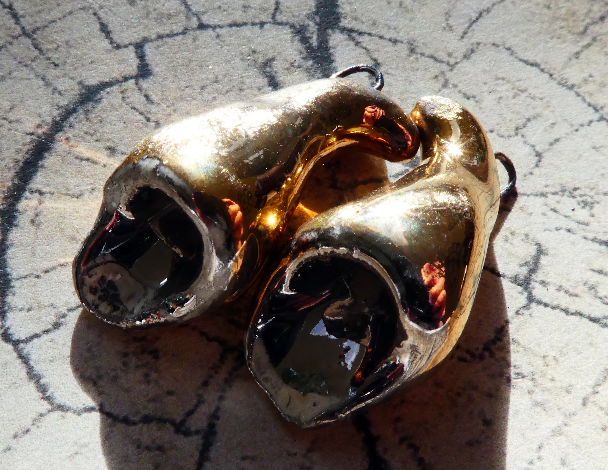 Hand formed in Earthstone and high fired. Then fired again with gloss glaze. Applied with Platinum and Gold lustres, and fired once more.