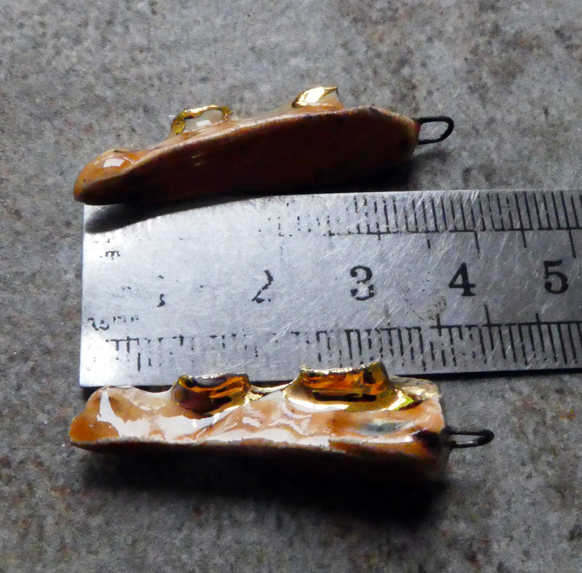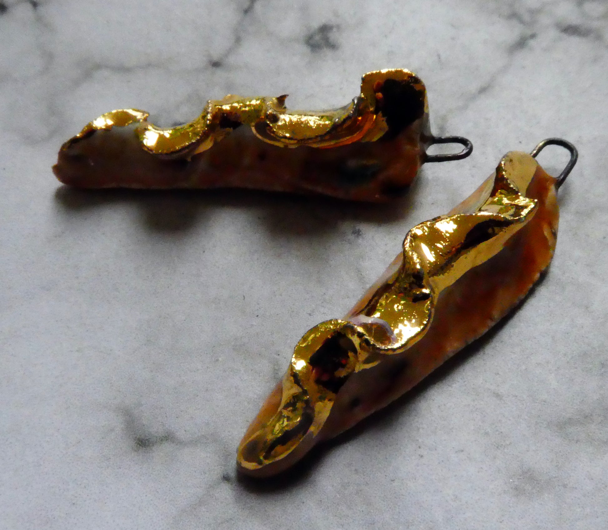 Hand formed in Earthstone and high fired. Then fired again with Cognac and Gloss glaze. Applied with Gold Lustre, and fired once more.
