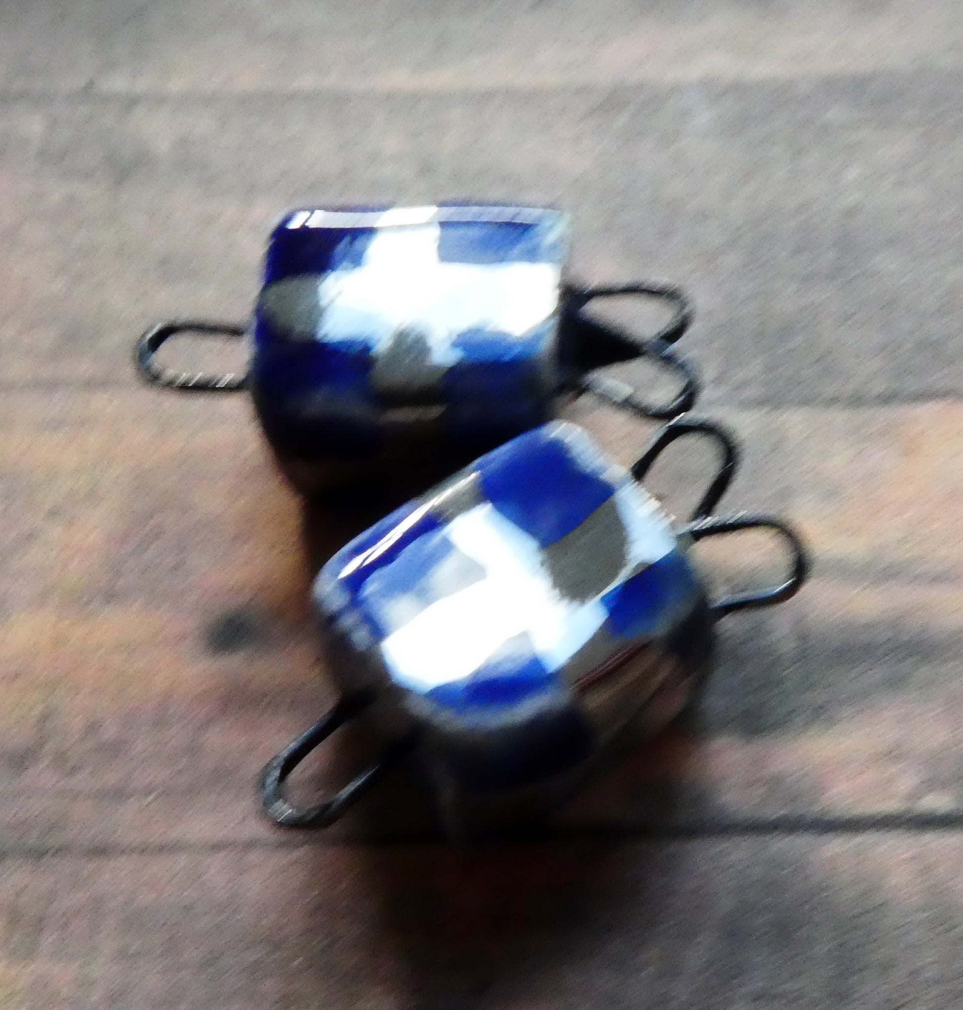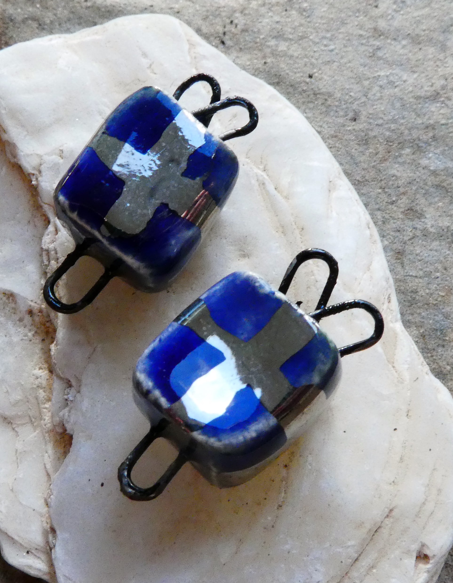 Hand formed in Earthstone and high fired. Then fired again with Mirror Blue glaze. Applied with Platinum lustre ribbon accents.
