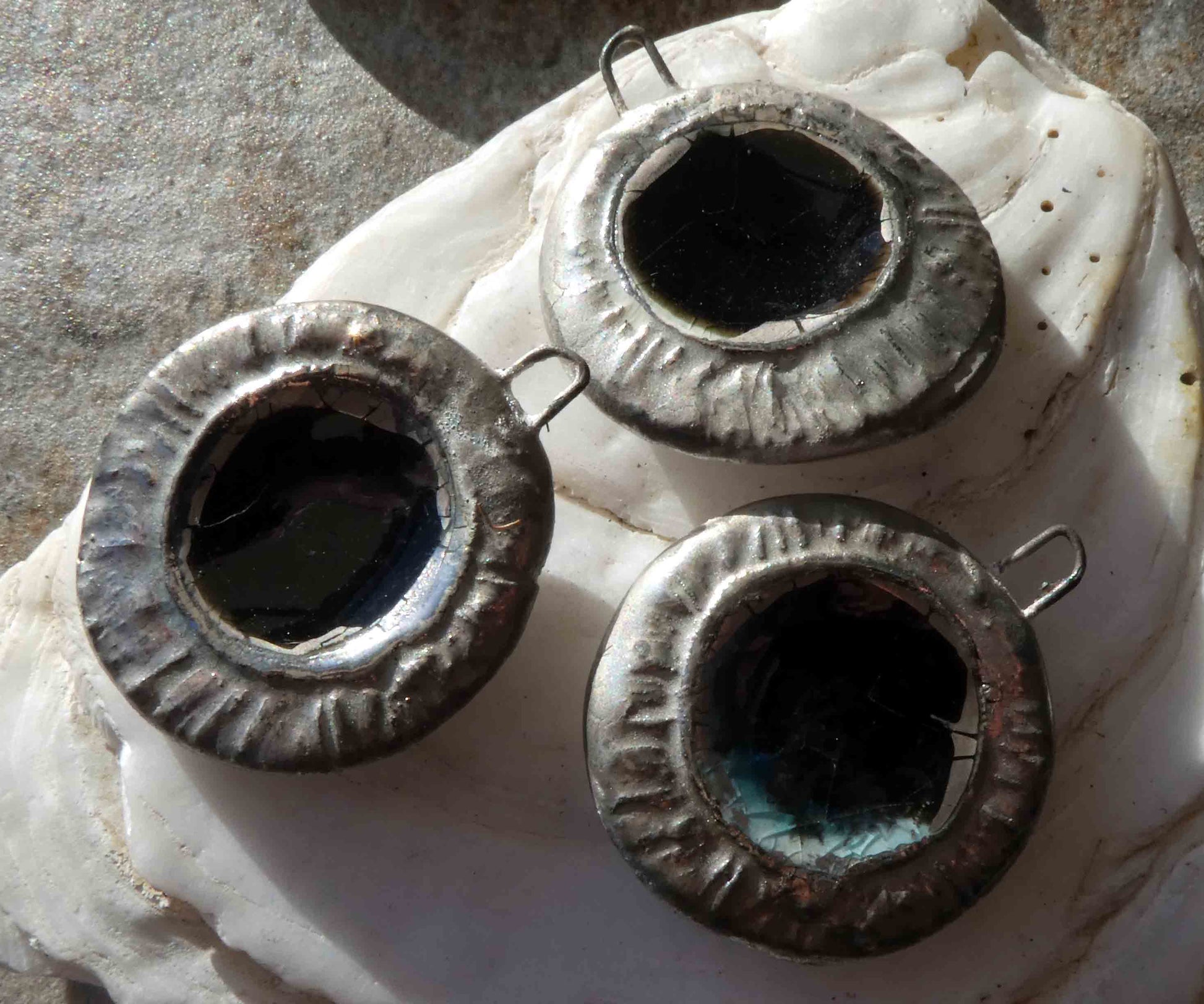 Hand formed in Earthstone and high fired. Then fired again with black glass and glaze. Applied with .999 fine silver and Platinum Lustre and fired again.