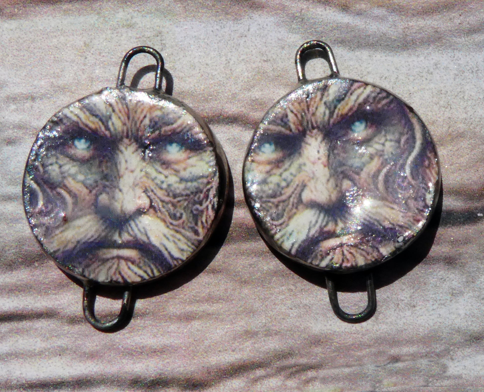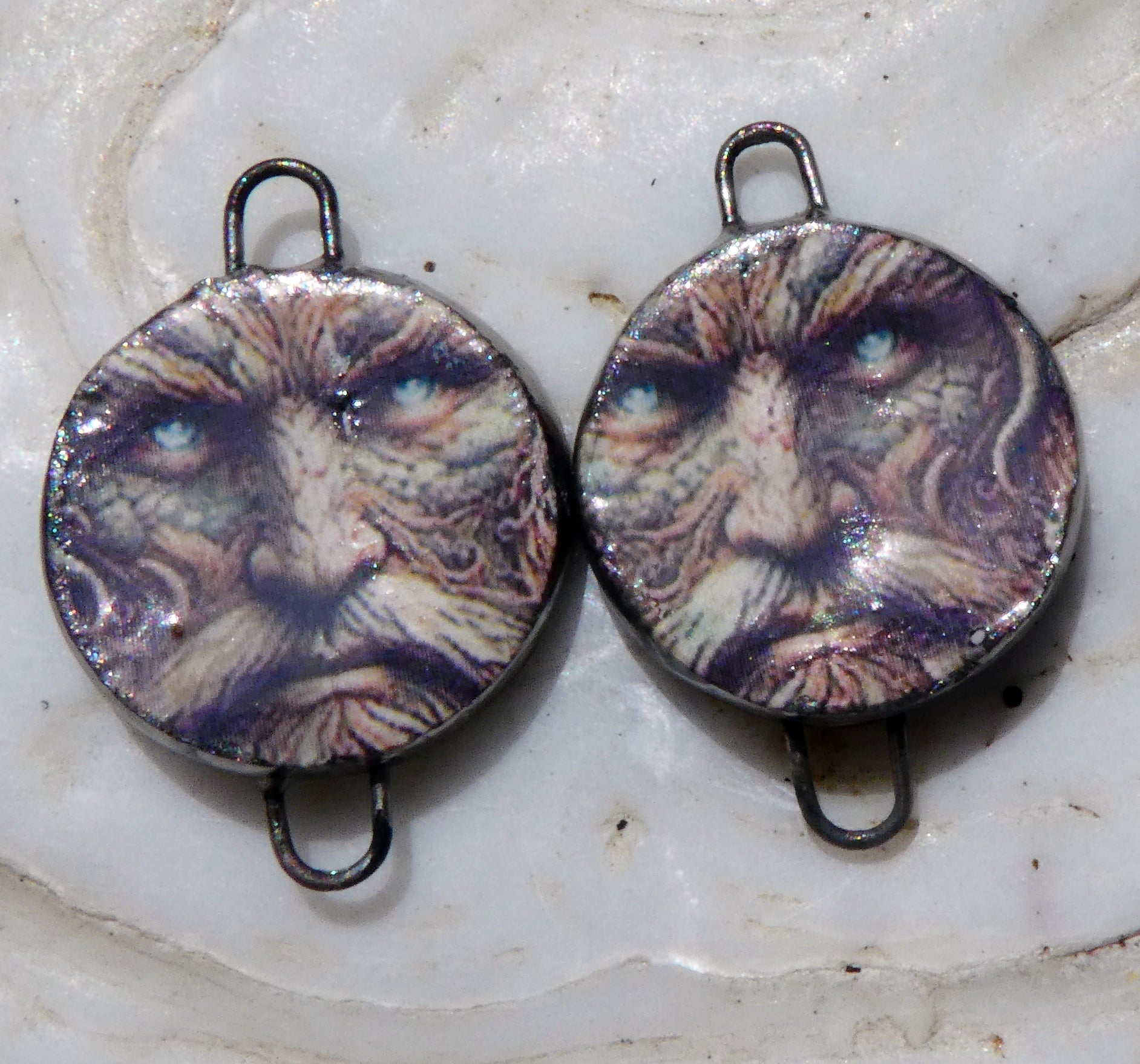 Hand formed in Earthstone and high fired. Then fired again with bronze clay and Gloss glaze. Fired again with Green Man decals, then applied with lustre, and fired once more.