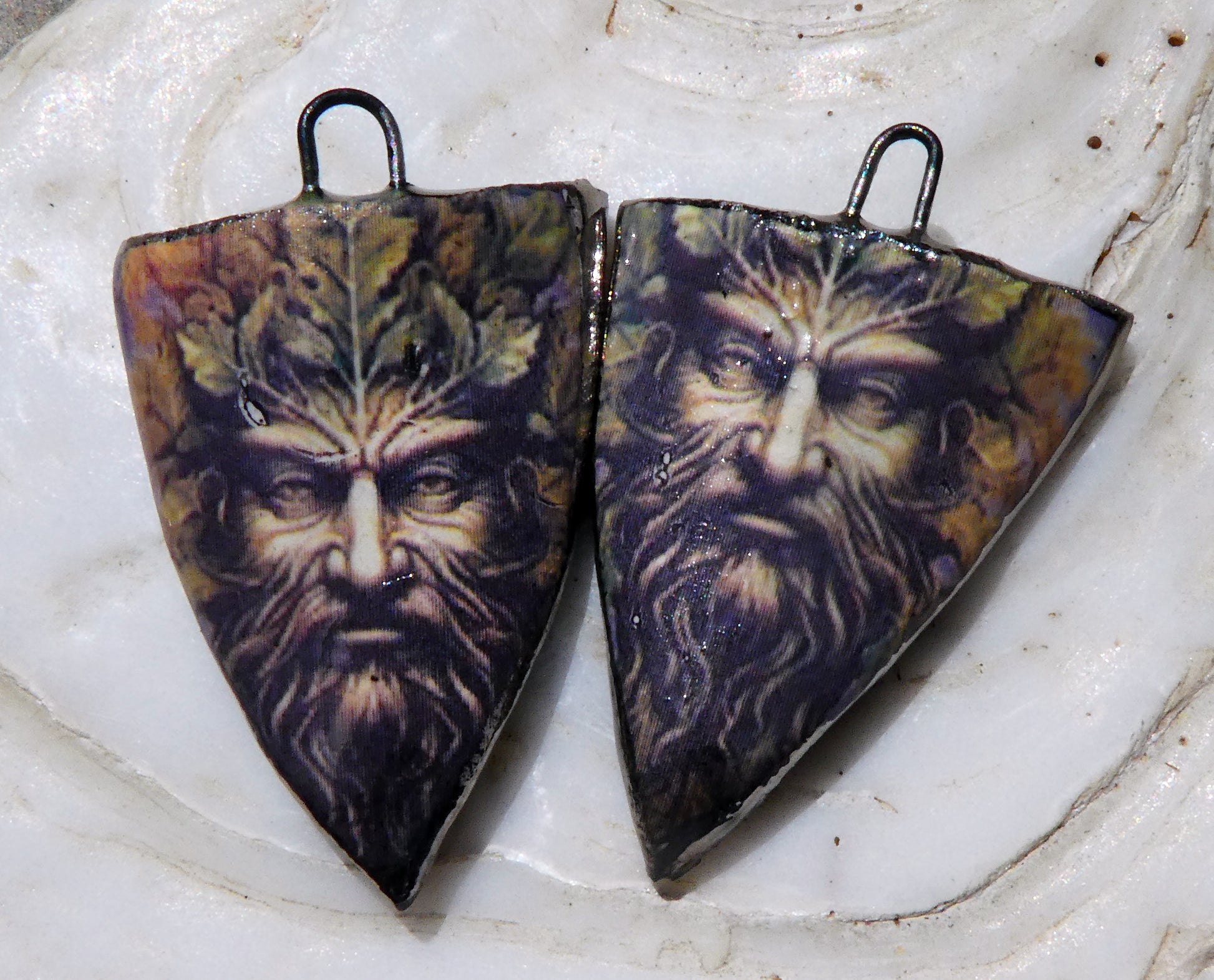 Hand formed in Earthstone and high fired. Then fired again with bronze clay and Gloss glaze. Fired again with Green Man decals, then applied with lustre, and fired once more.