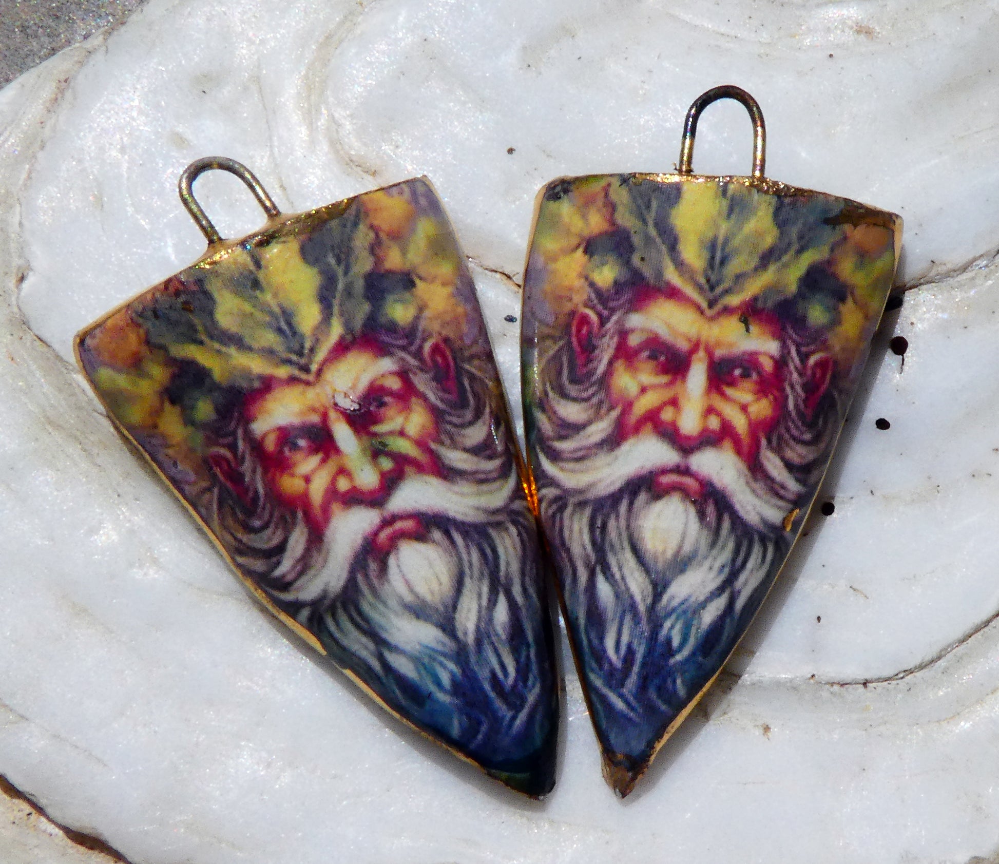 Hand formed in Earthstone and high fired. Then fired again with bronze clay and Gloss glaze. Fired again with Green Man decals, then applied with lustre, and fired once more.