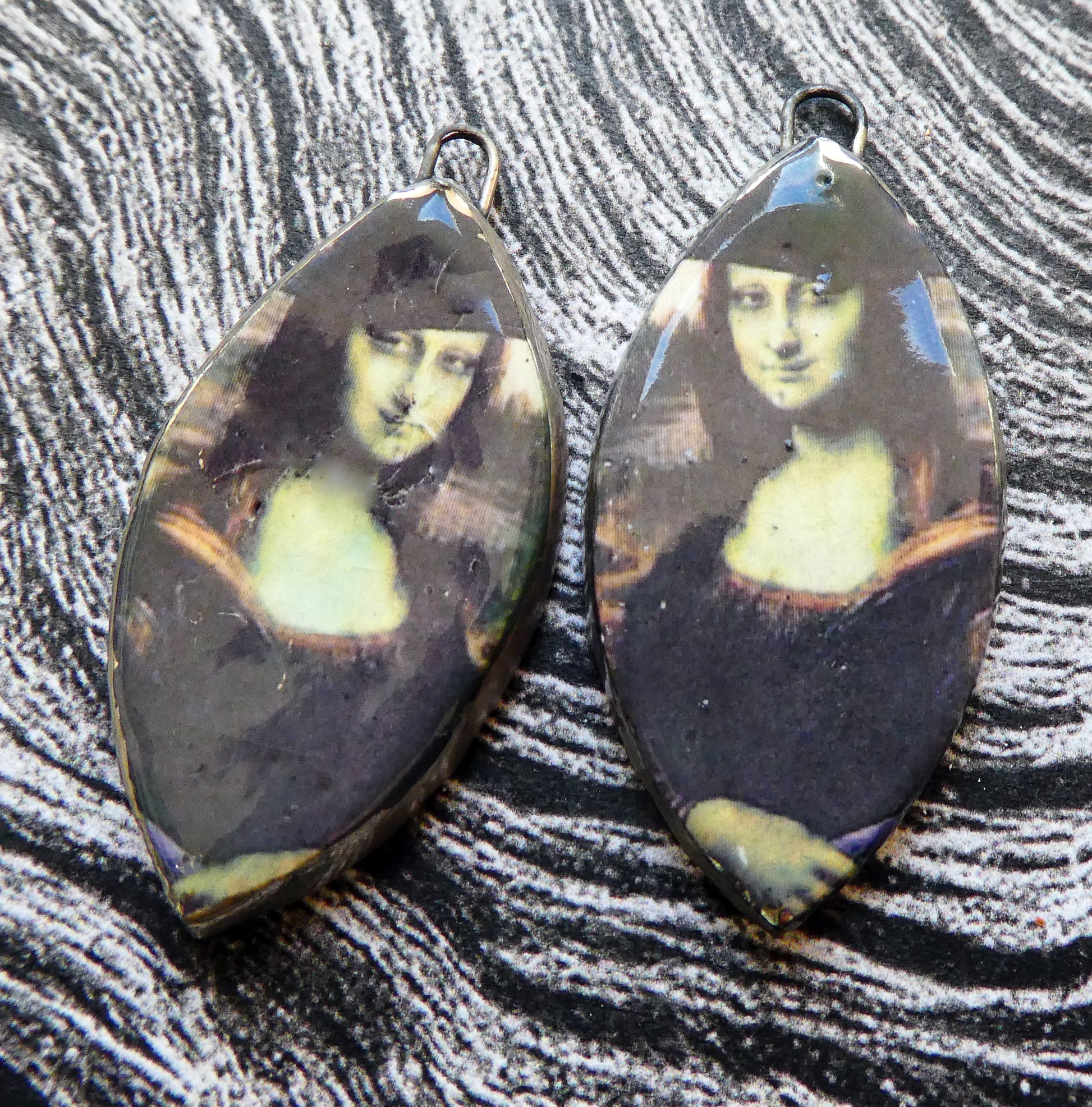 Hand formed drops, fired with gloss glaze and Bronze clay. Then applied with decals and fired again. Applied with lustre and fired once more. Scorched to a rainbow finish on the backs.