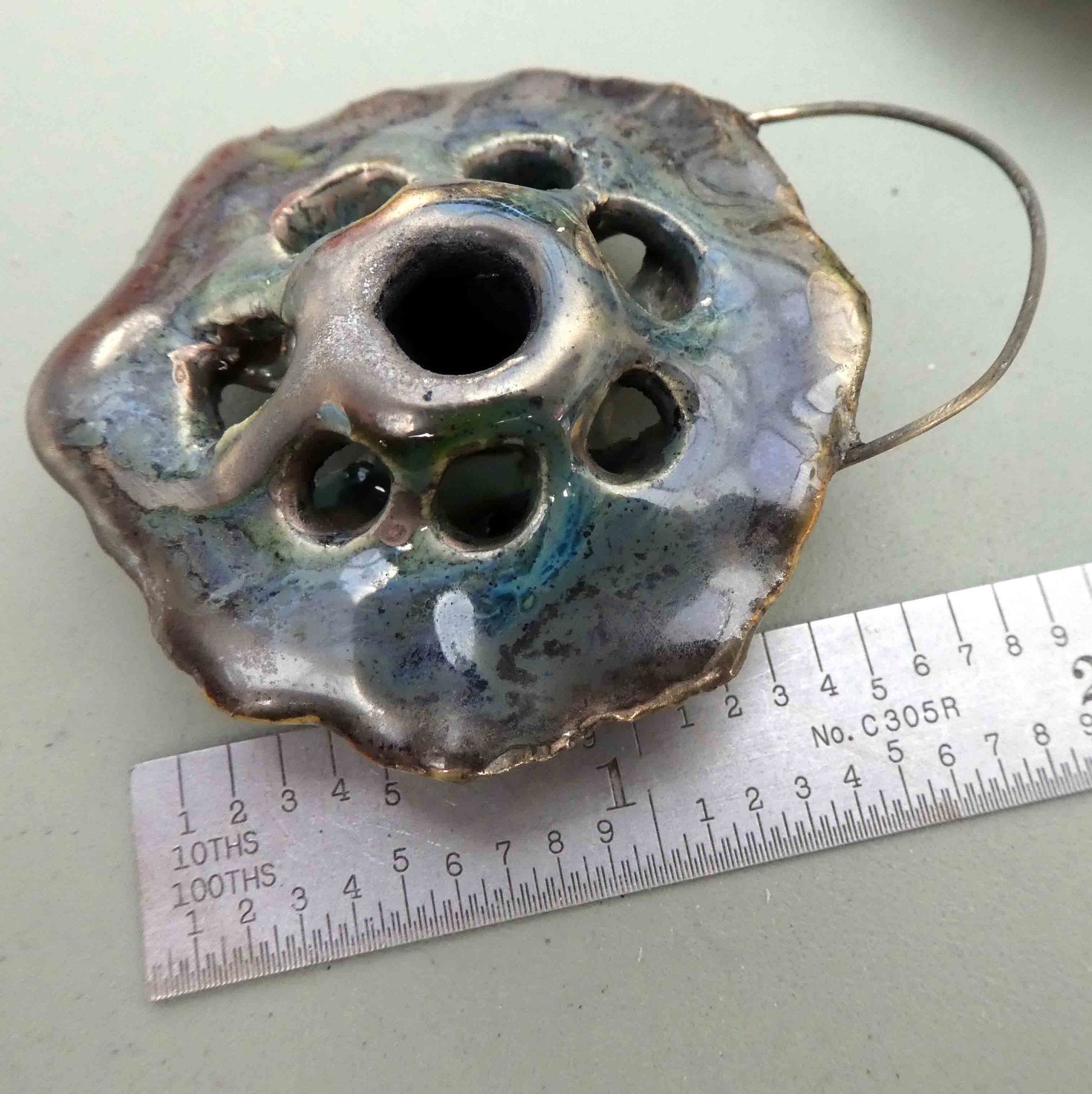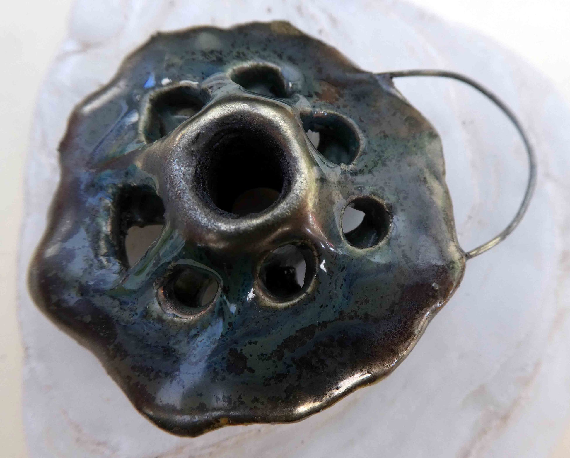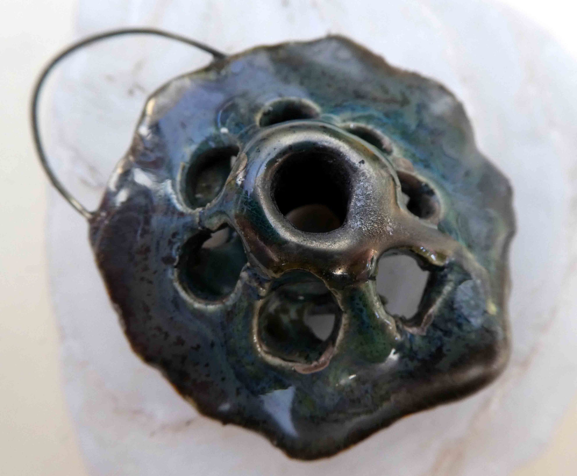 A hollow, holey pendant. Hand formed hollow pendant formed around a central tube. With holes in the surfaces, and pinched out edges. High fired, then fired again with Bronze clay,gloss and Astronomical glaze. Then fired again with Platinum lustre in the inner sections. 2 inches, and lightweight. ©ScorchedEarthDesigns