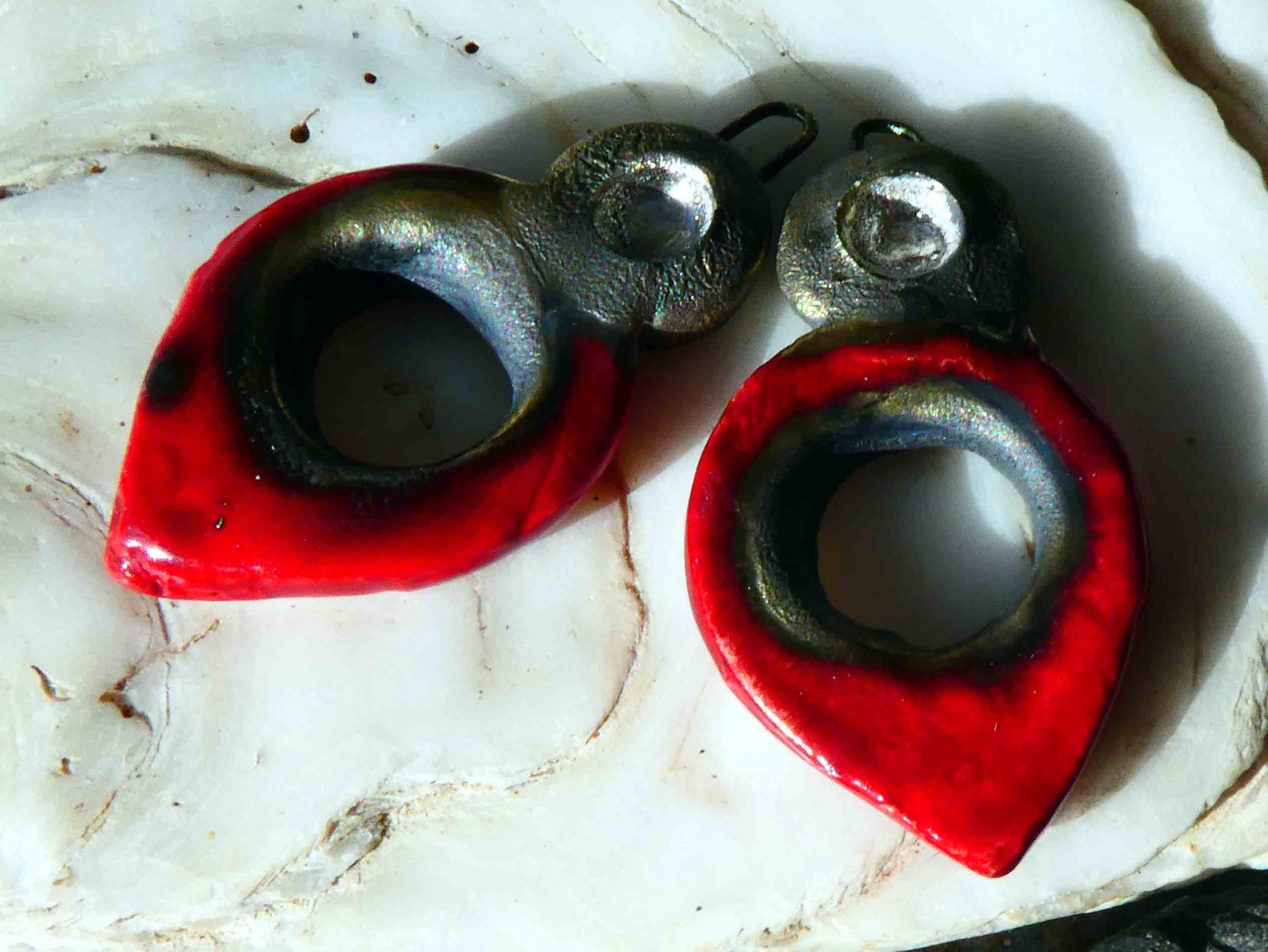 Hand formed in Earthstone, and high fired. Then fired again with bronze clay and Red glaze.