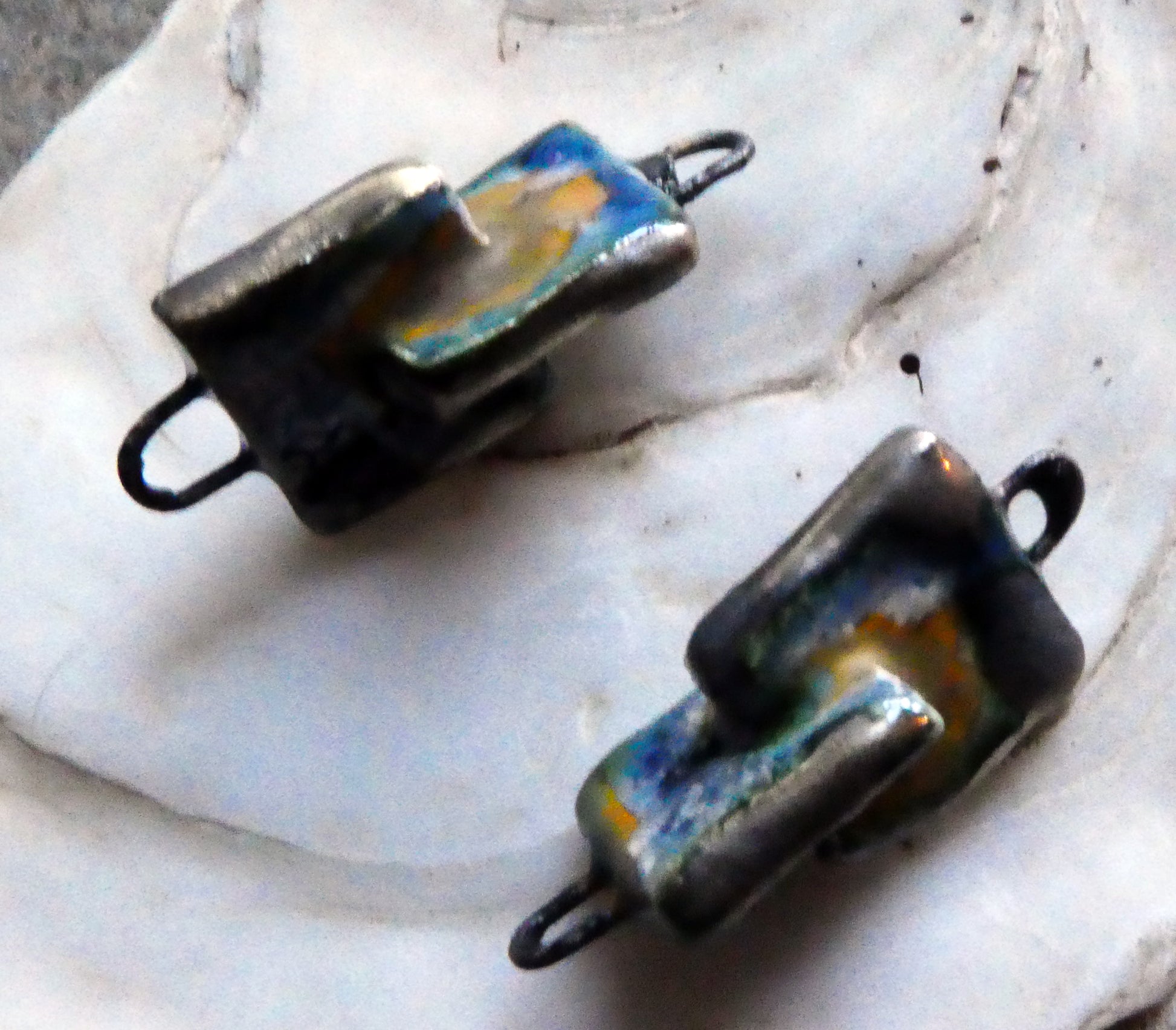 Hand formed in Earthstone and high fired. Then fired again with bronze clay and Outer Space glaze.