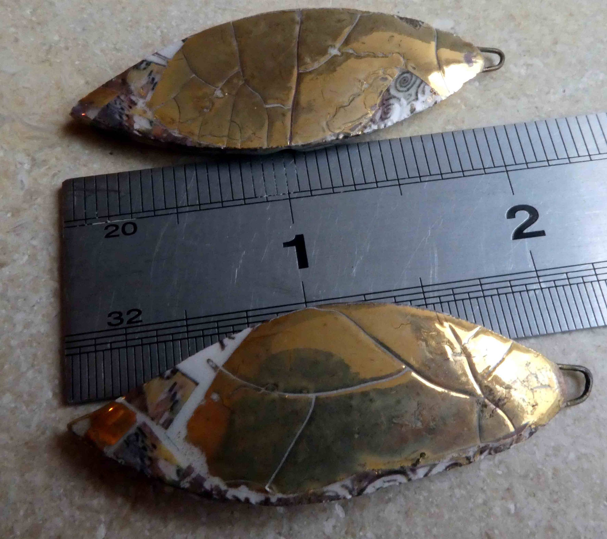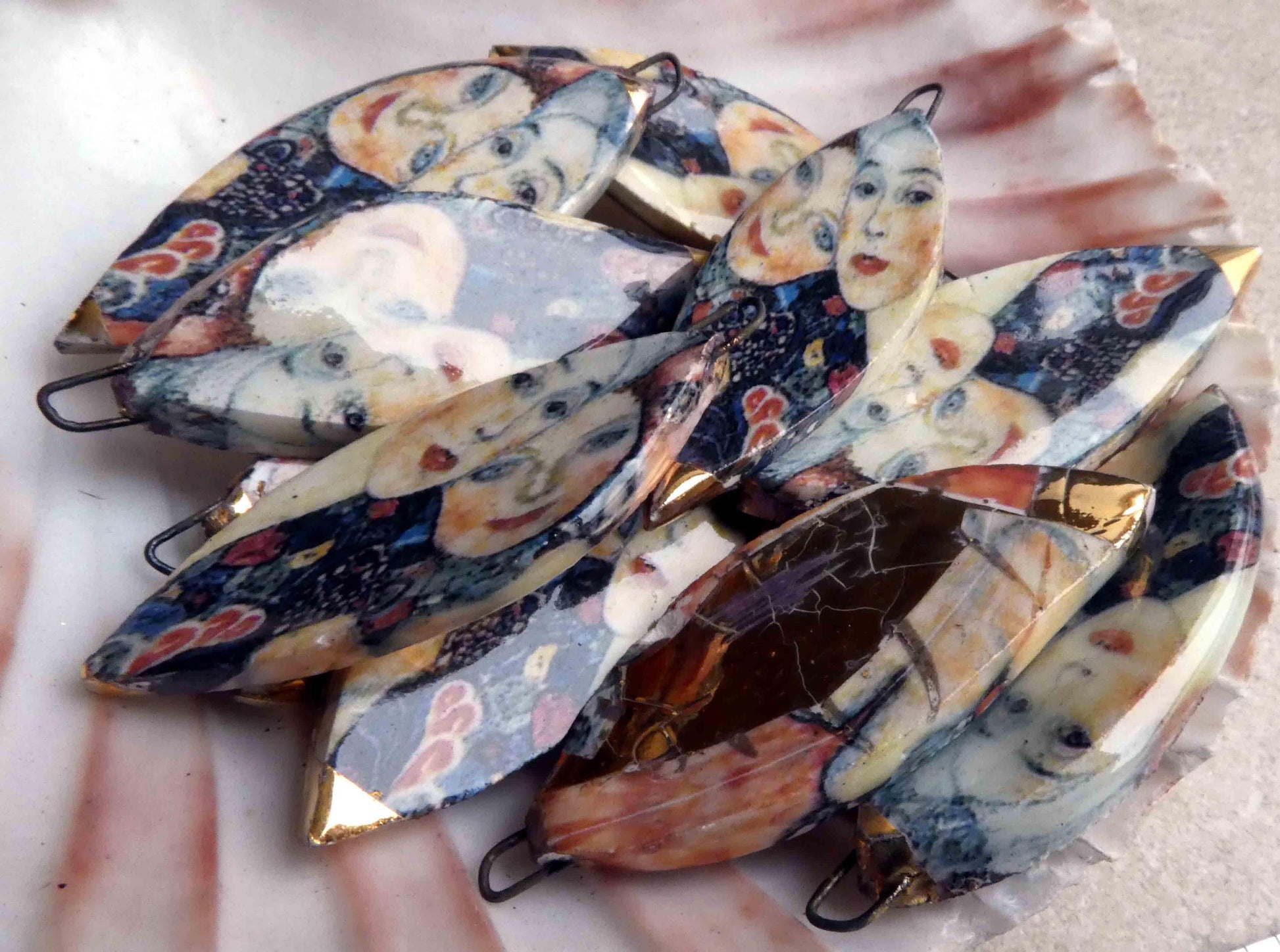 A pair of lightweight feminine droppers. Hand formed, droppers in Ming Porcelain, high fired. Then fired again with gloss glaze. Applied with beautiful matching Klimt print ceramic decals and Gold Lustre, then fired again 40mms, and lightweight. ©ScorchedEarthDesigns