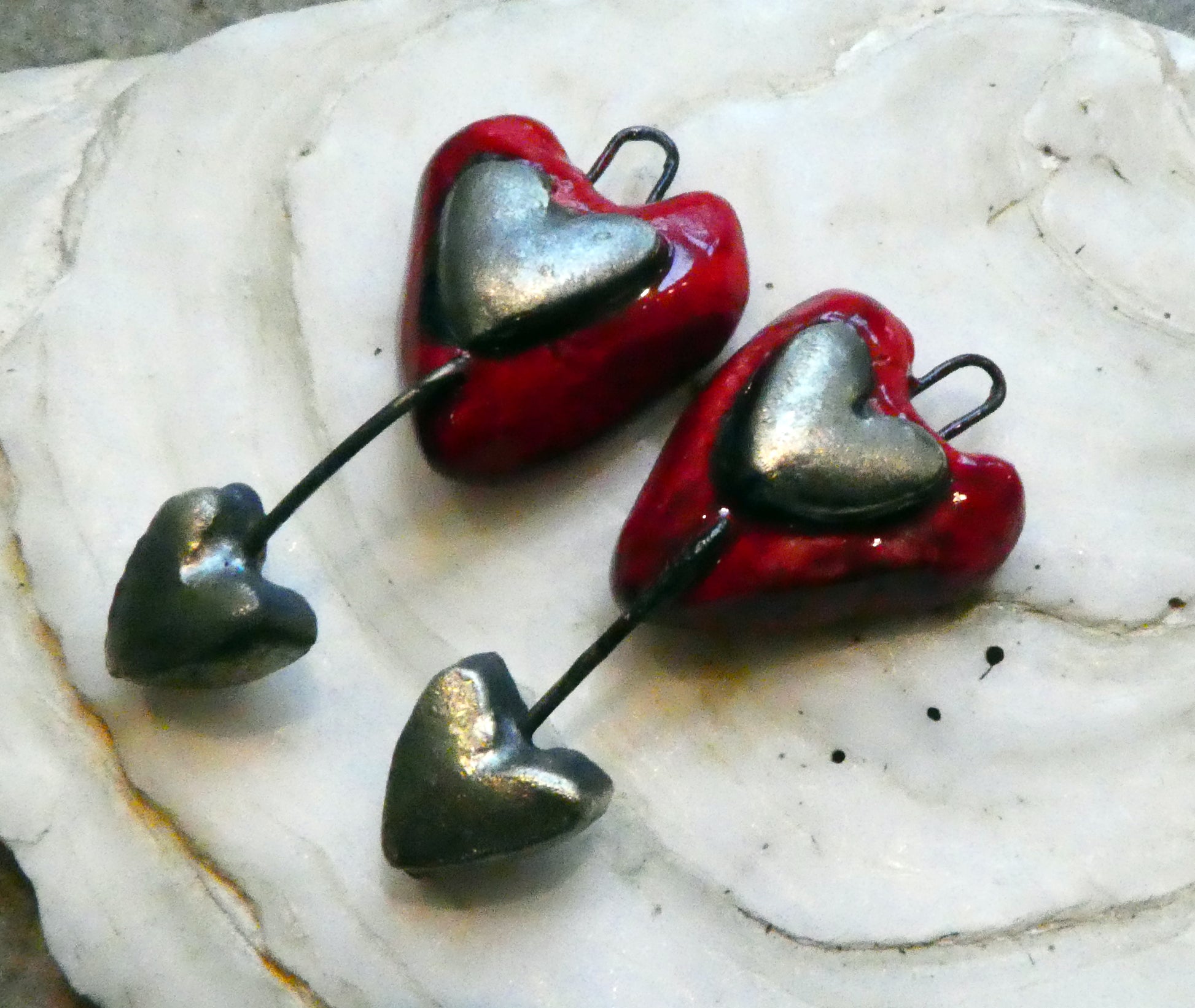Hand formed in Earthstone and high fired. Then fired again with Bronze clay and Red glaze.