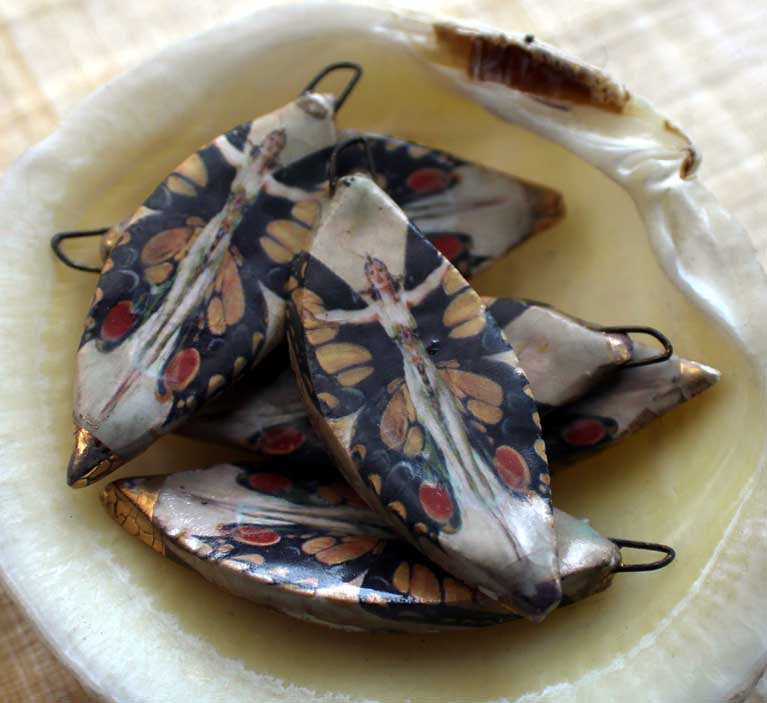 A pair of lightweight droppers. Hand formed droppers, fired with gloss glaze. Then applied with Leyendecker ceramic decals and fired again with Gold Lustre. 40mms, and very lightweight.