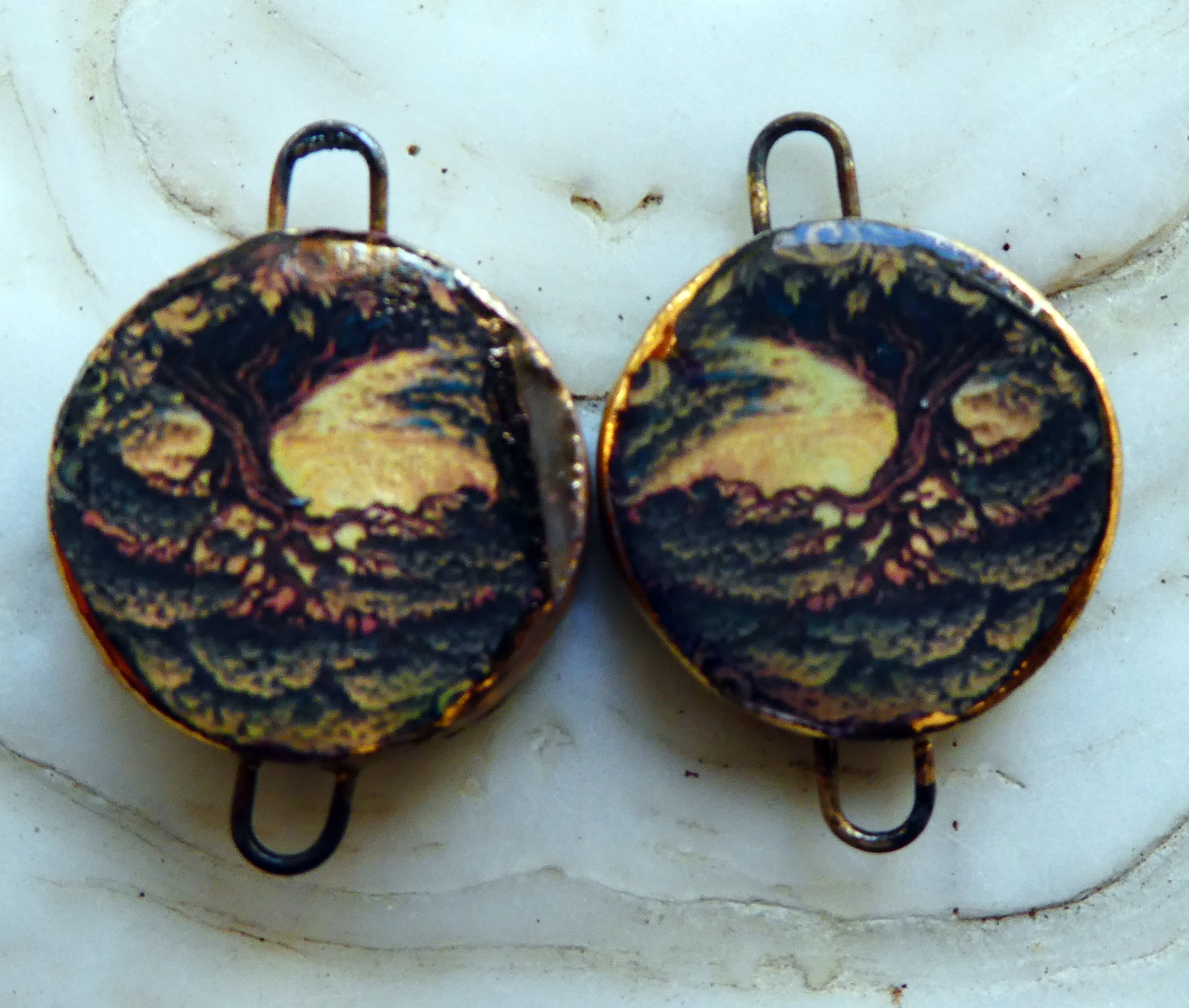 Hand formed little discs in Earthstone, fired with gloss glaze and bronze clay. Then applied with tree decals and lustre, and fired again.