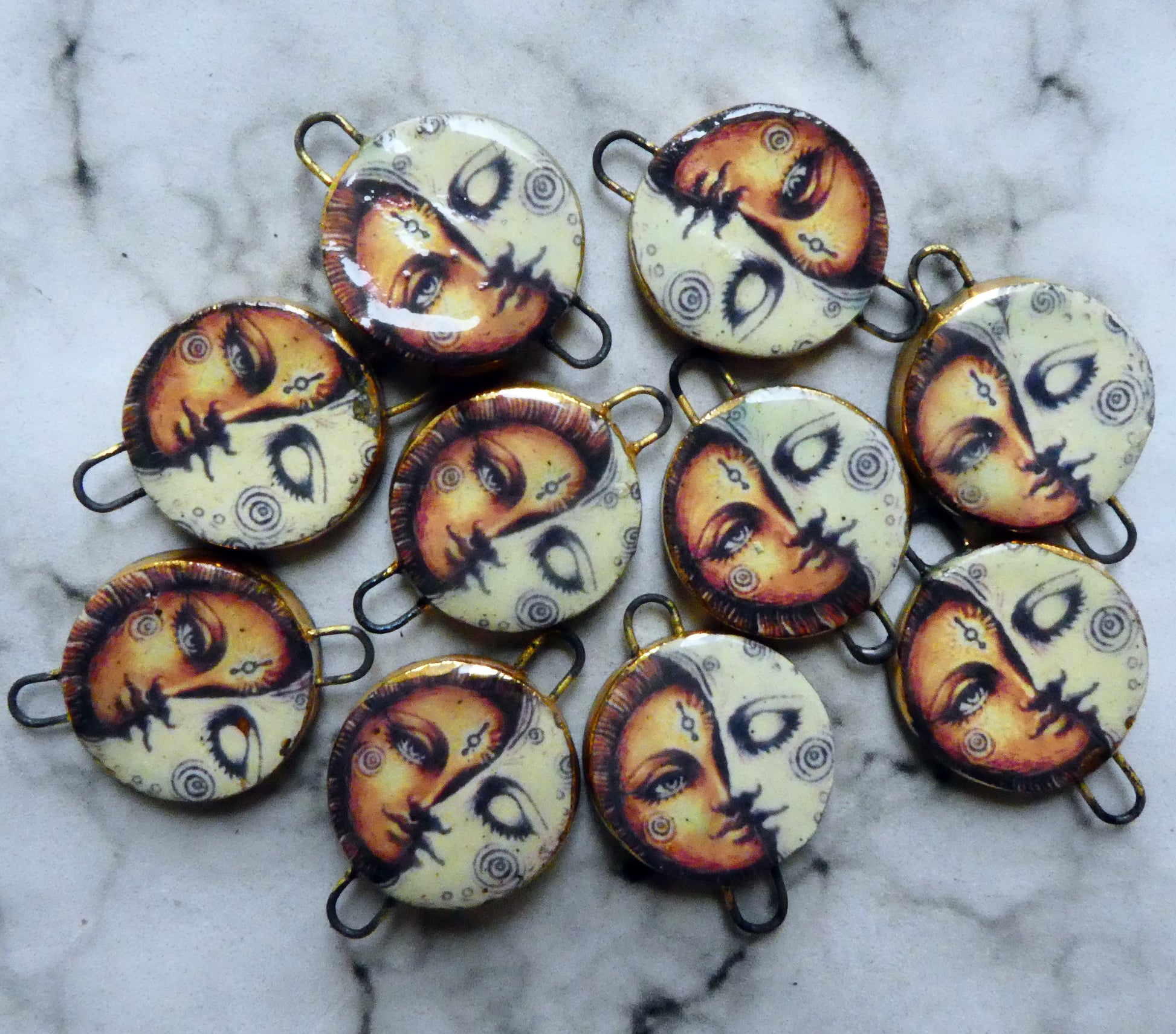 Ceramic Little Disc Vintage Sun and Moon Decal Earring Connectors #1
