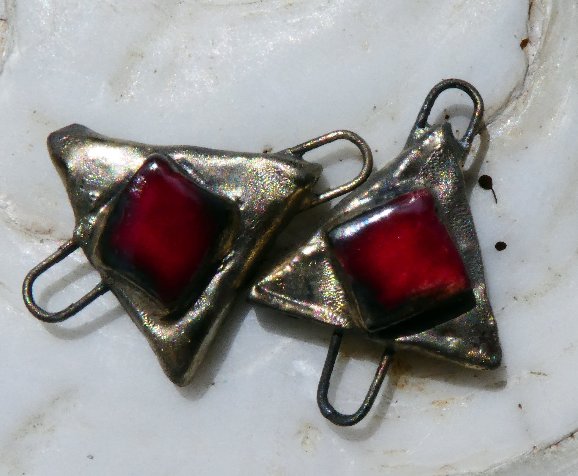 Hand formed in Earthstone and high fired. Then fired again with bronze clay and Red glaze.