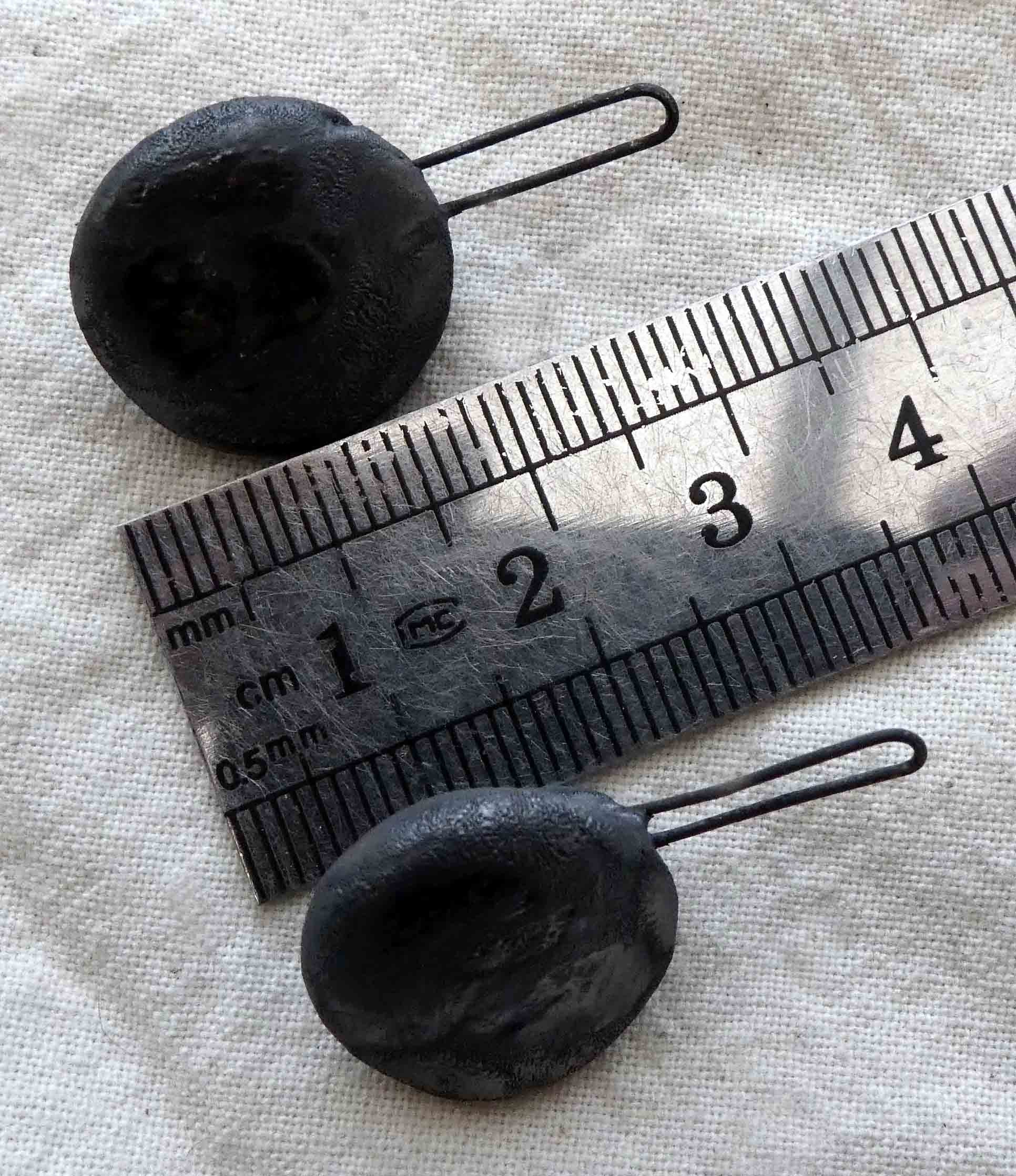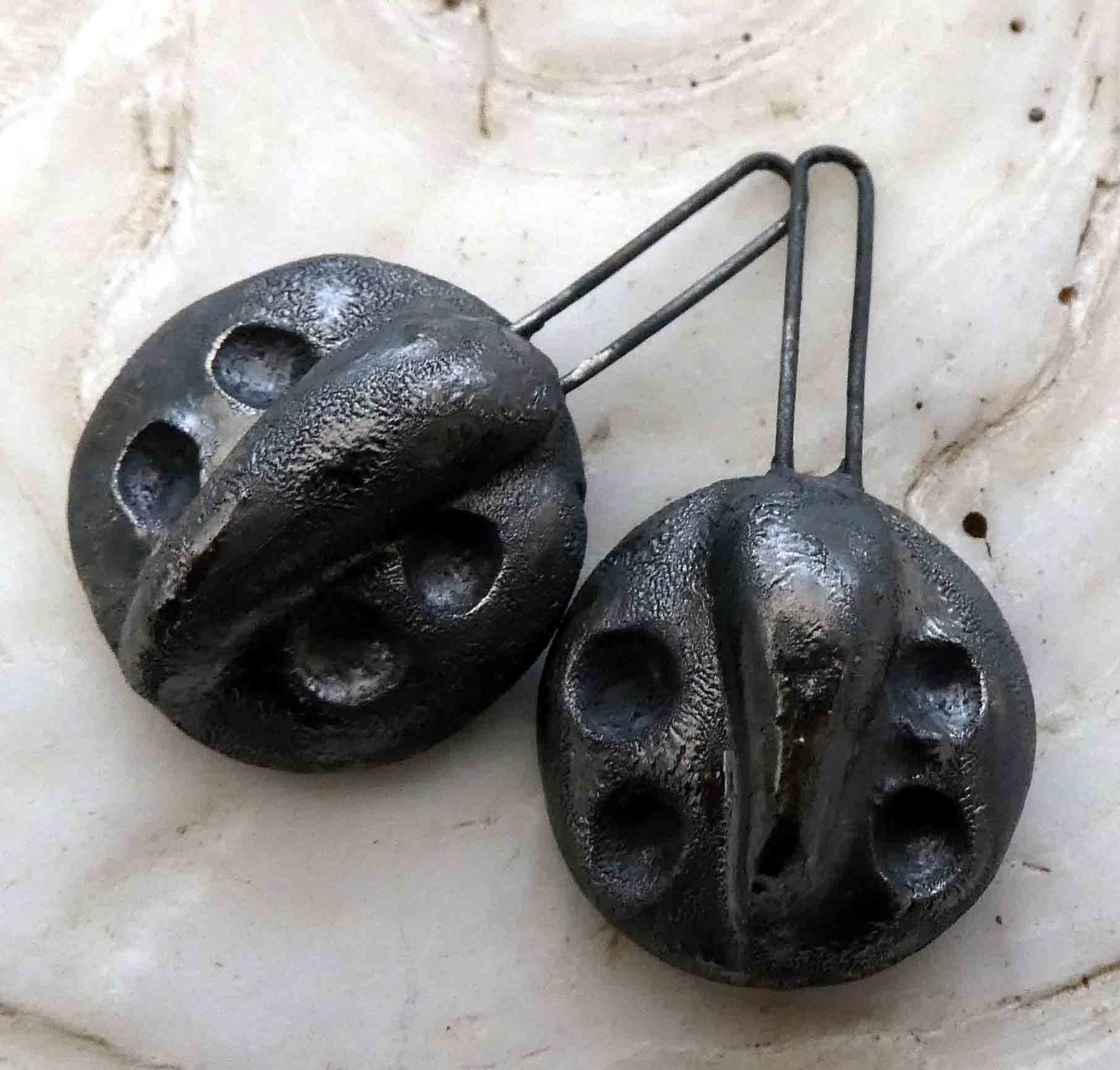 A pair of moulded glazed disc drops earring charms on hoops. Hand formed in Earthstone, high fired. Then fired again with Steel glaze.. 20mms plus hoop, and very lightweight. ©ScorchedEarthDesigns