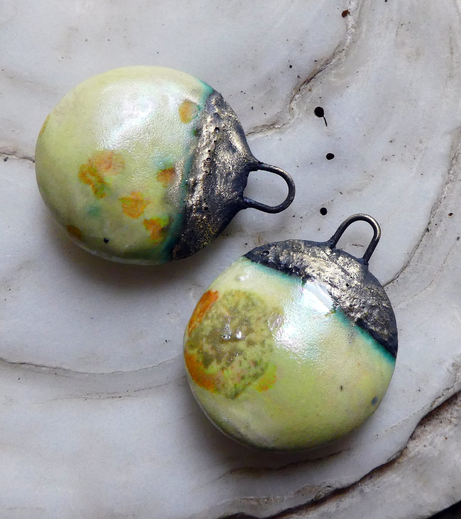 Hand formed in Earthstone and high fired. Fired again with bronze clay and Haystack glaze. Applied with Mother of Pearl lustre, and fired once more.