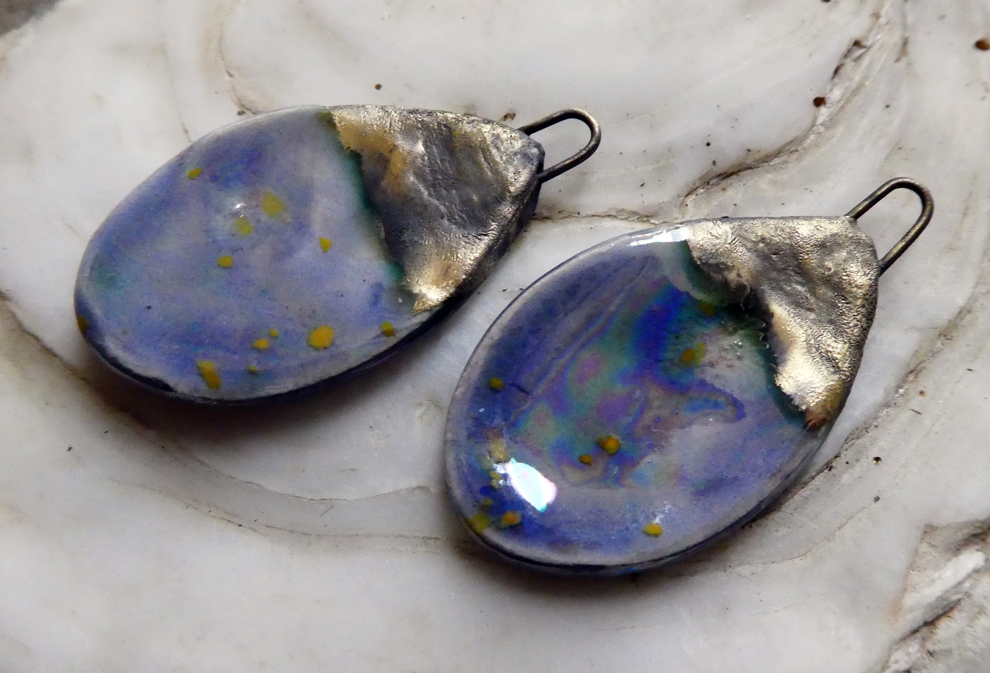 Hand formed in Earthstone and high fired. Fired again with bronze clay and Peritwinkle glaze. Applied with Mother of Pearl lustre, and fired once more.