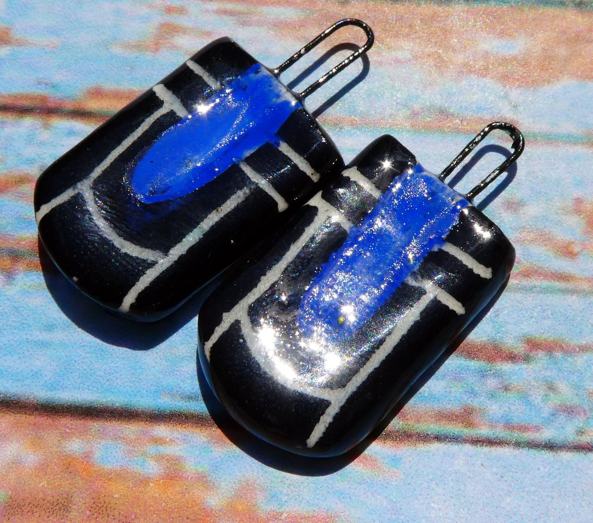 Hand formed in Earthstone and high fired with matte black glaze into which the design has been etched. Applied with Holiday Blue and Gloss glaze and fired again.