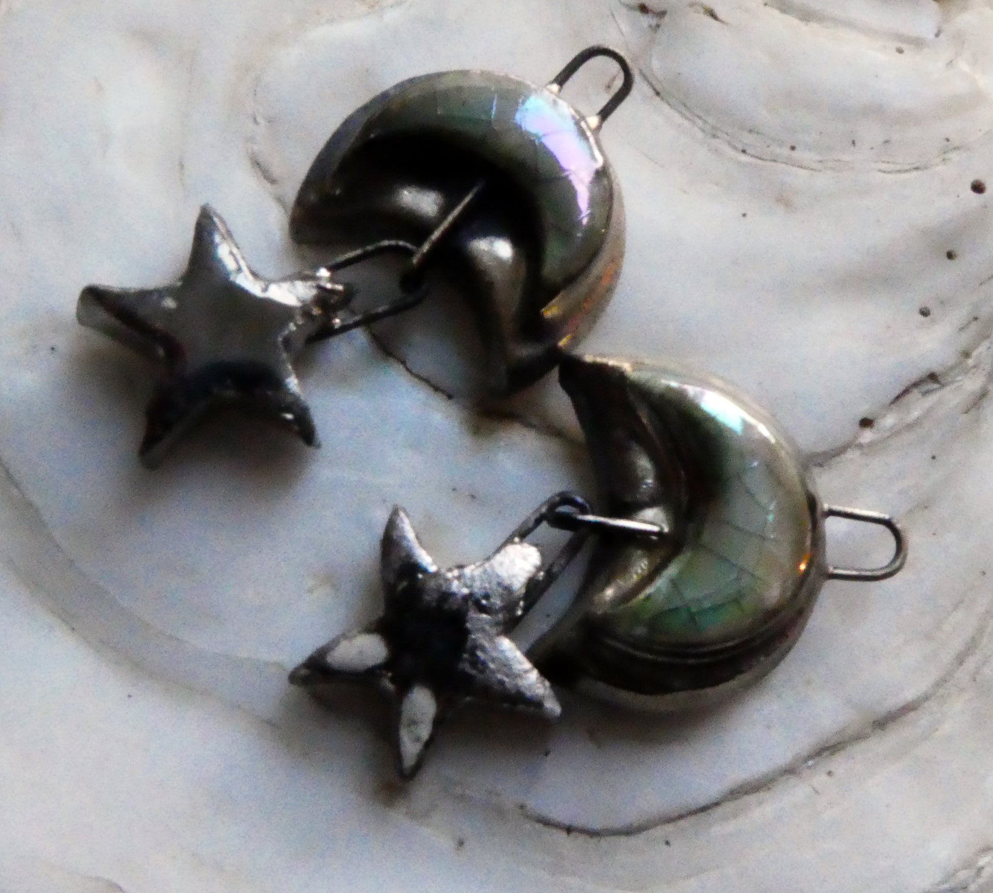 Ceramic Lustrous Moulded Moon and Star Earring Dangles- Aquamarine Crackle