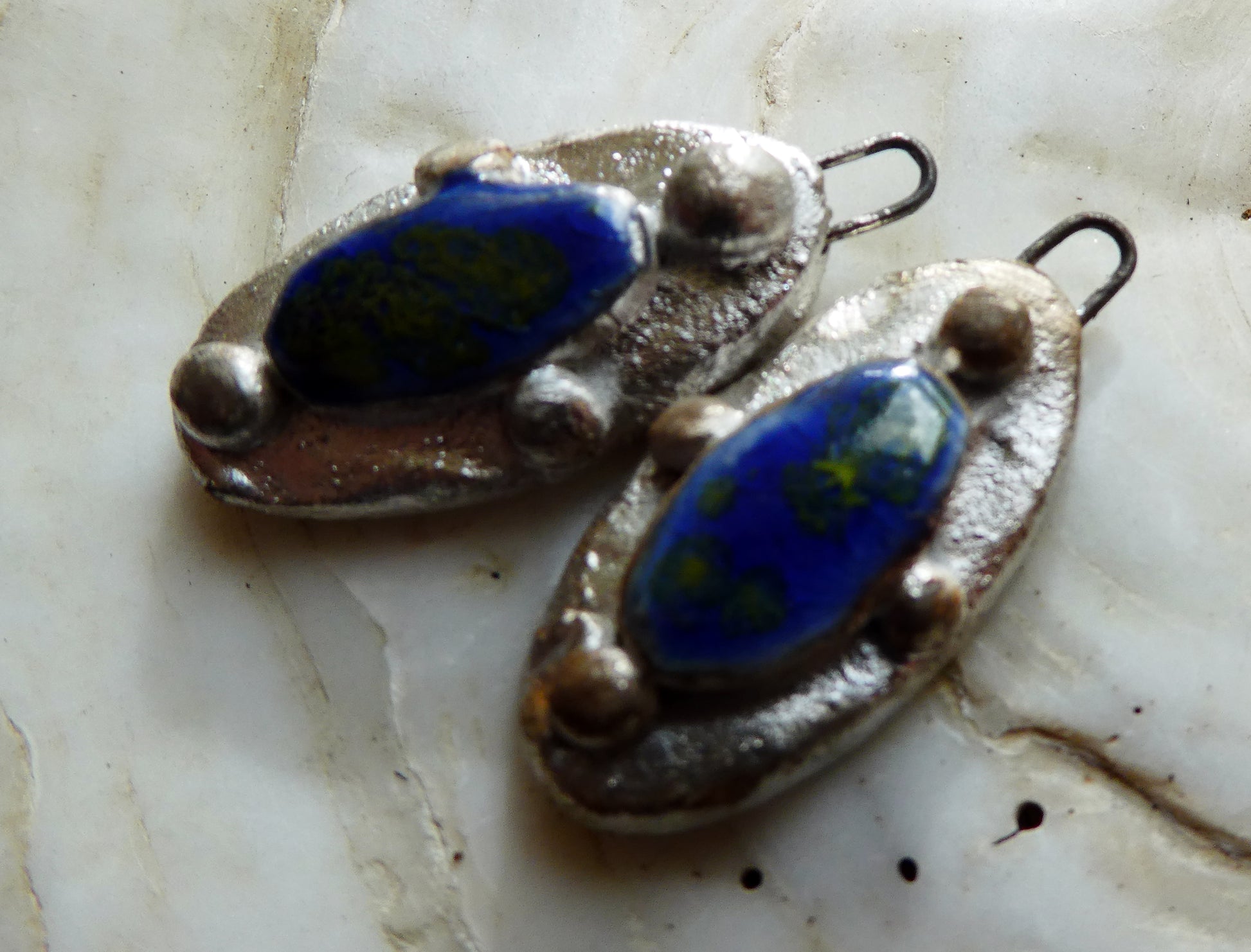 Hand formed in Earthstone and high fired. Then fired again with Starry Night glaze. Applied with .999 Fine Silver and fired again. Fired once more with Mother of Pearl lustre.