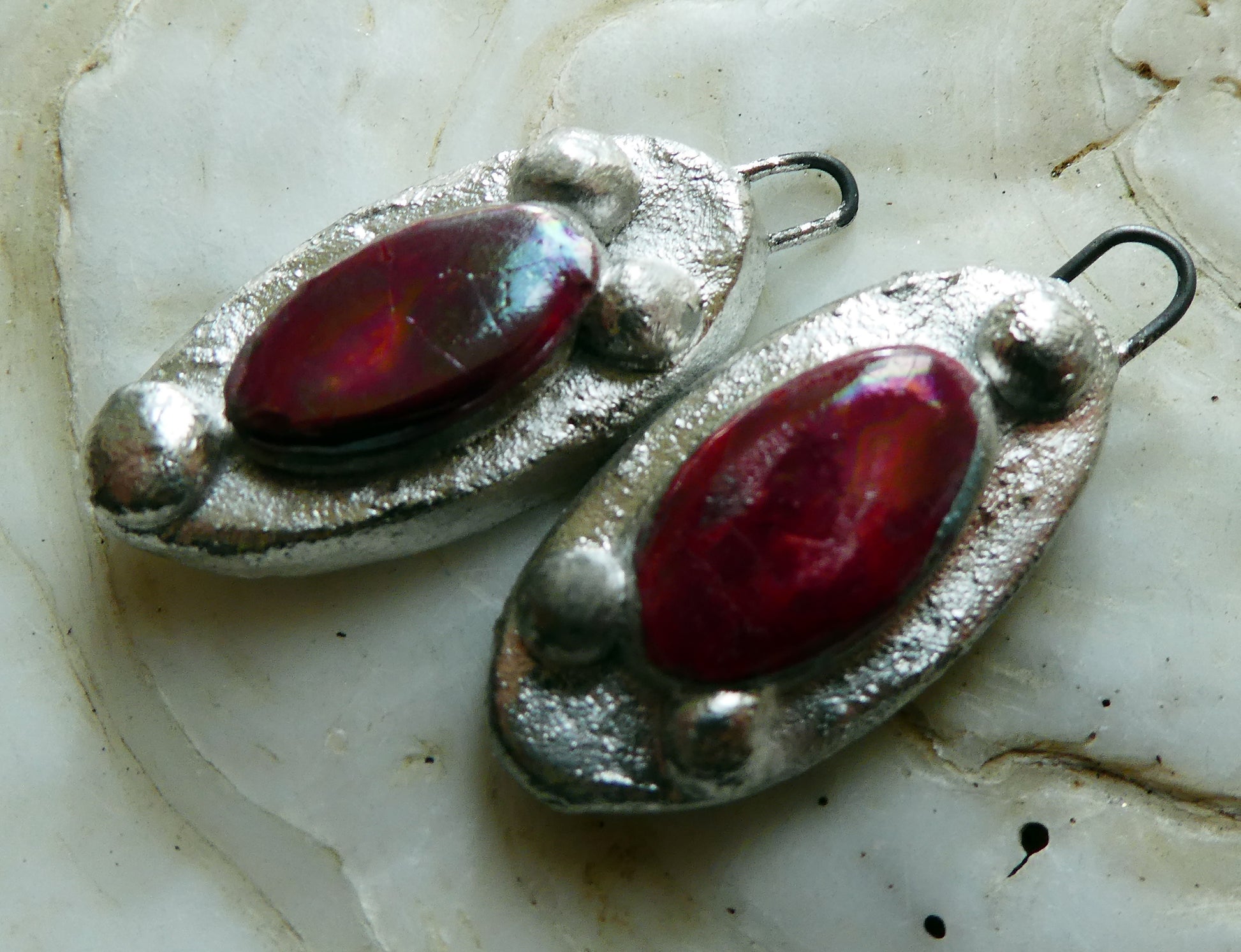 Hand formed in Earthstone and high fired. Then fired again with Red glaze. Applied with .999 Fine Silver and fired again. Fired once more with Mother of Pearl lustre.