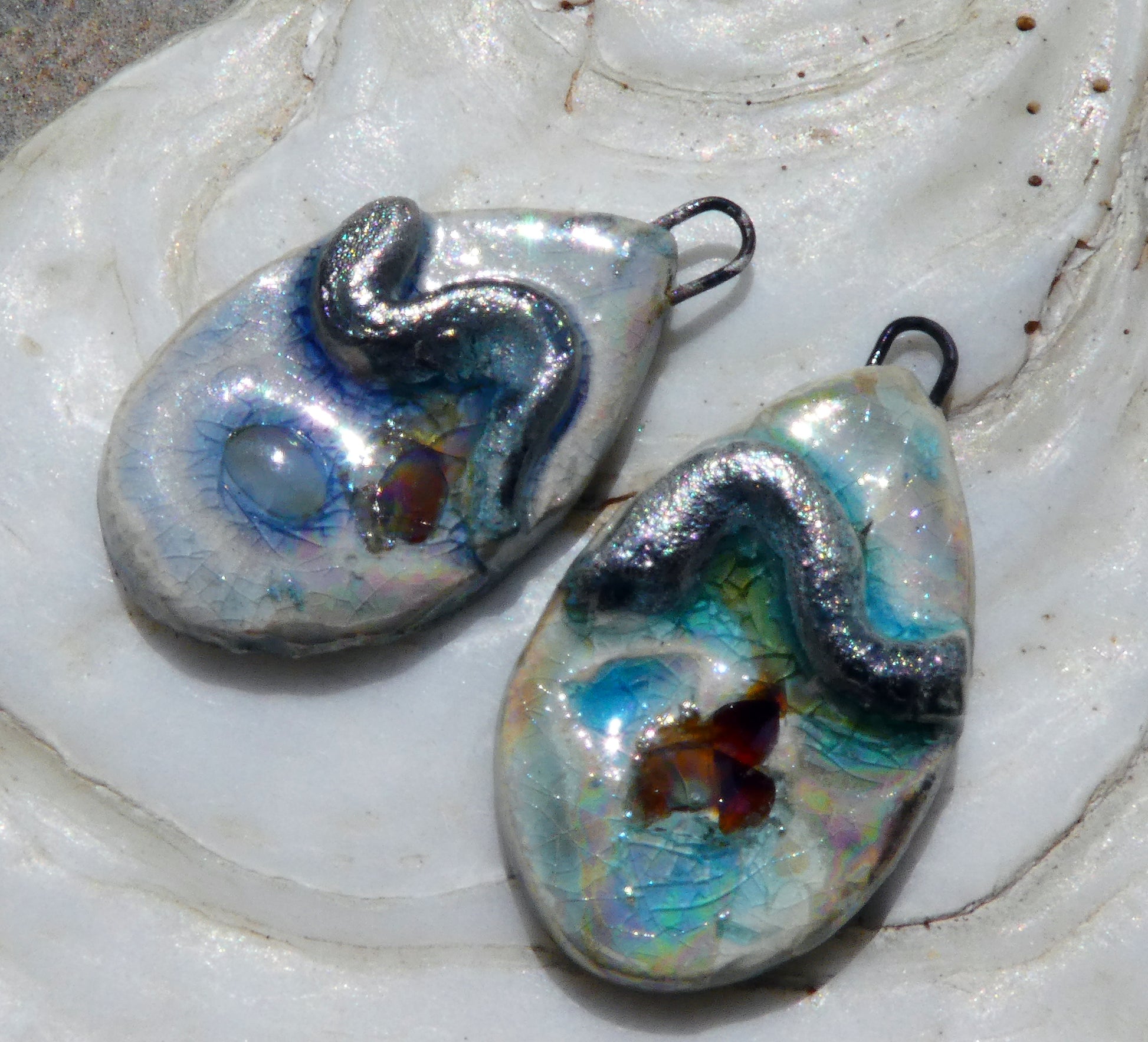 Hand formed in Earthstone and high fired with small nuggets of seaglass found on the beach. Then fired again with Water glaze. Applied with .999 Fine Silver and fired again. Then fired once more with Mother of Pearl lustre.