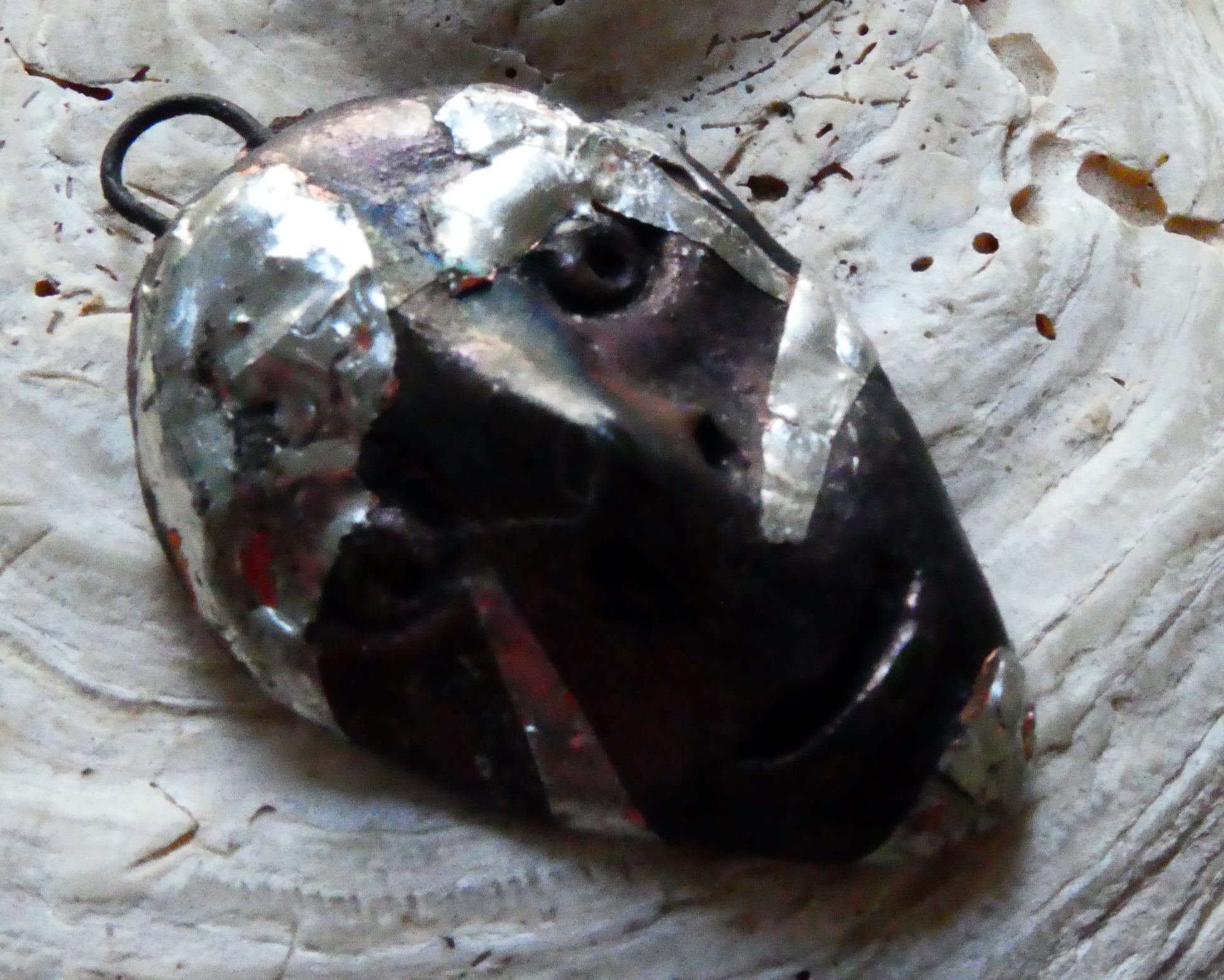 Hand sculpted in Earthstone and high fired. Fired again with bronze clay. With lead-free, jewellery grade solder accents. Scorched to a dark rainbow finish.