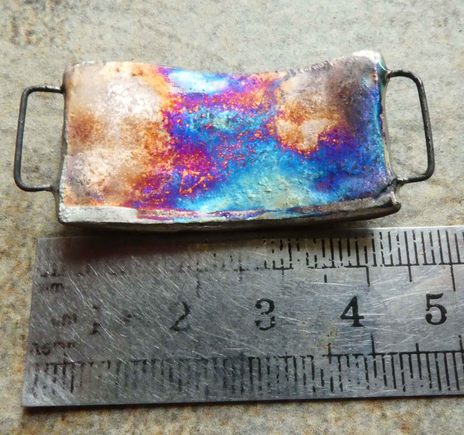Hand formed in Earthstone and high fired. Then fired again with bronze clay and Gloss glaze. Applied with a misty moor decal and fired again. The fired once more with Platinum Lustre. Slightly curved to fit a wrist.