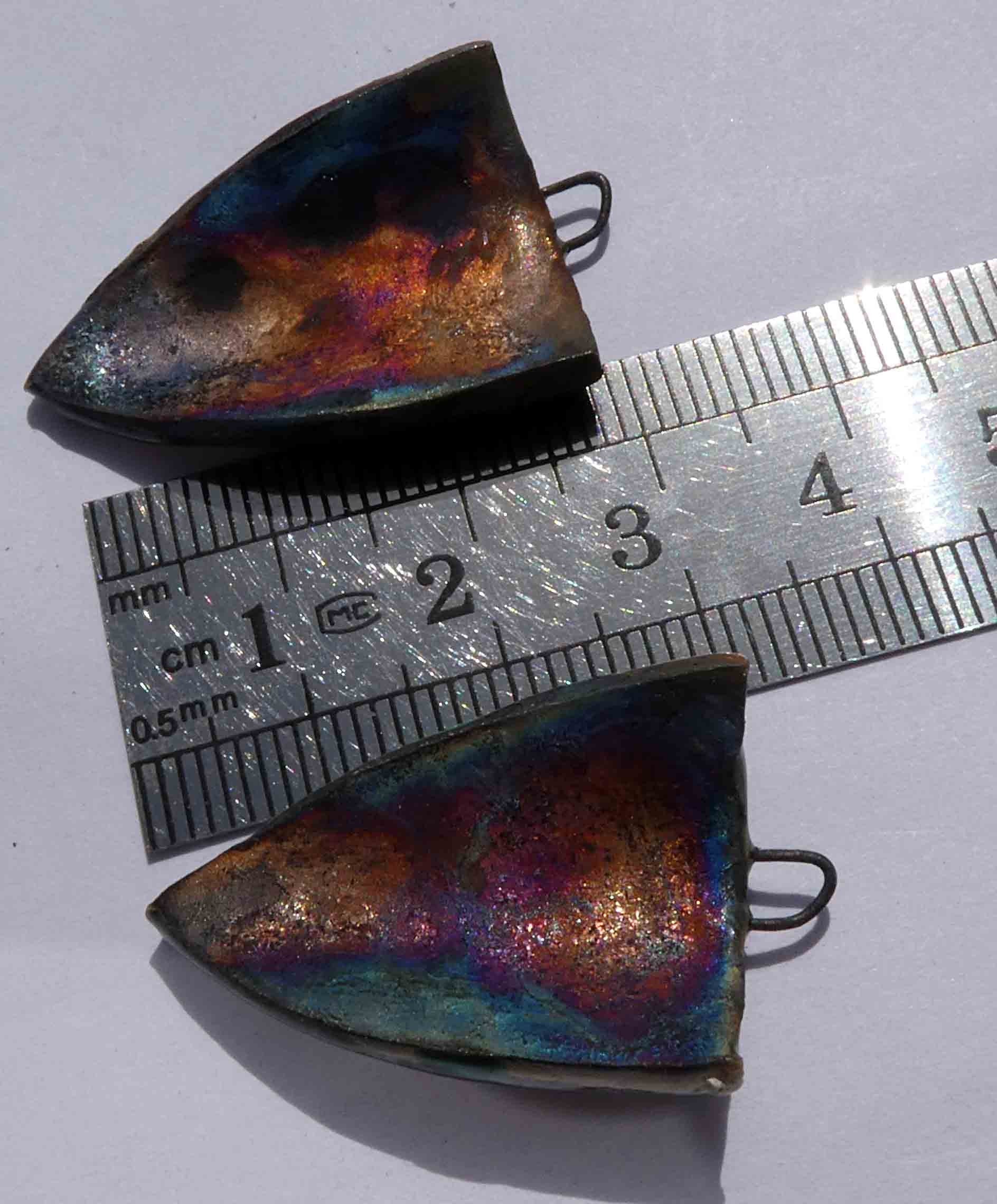 A pair of monkey face droppers. Hand formed shield shaped droppers in Bone China, and high fired. Then fired again with Bronze clay, and gloss glaze. Applied with photographic monkey ceramic decals, then fired again with Lustre. Scorched on the backs to a shimmery finish. 35ms, and very lightweight. ©ScorchedEarthDesigns