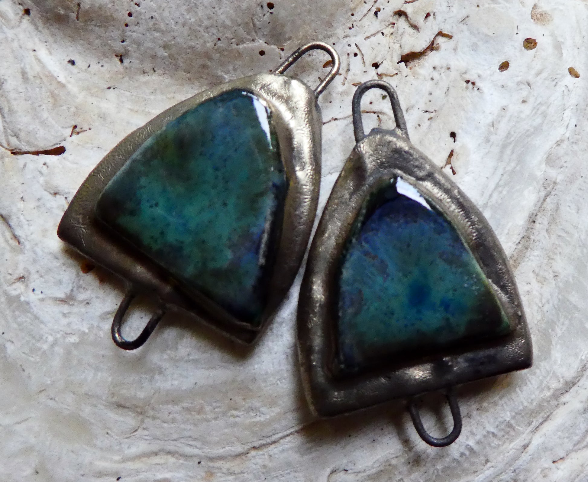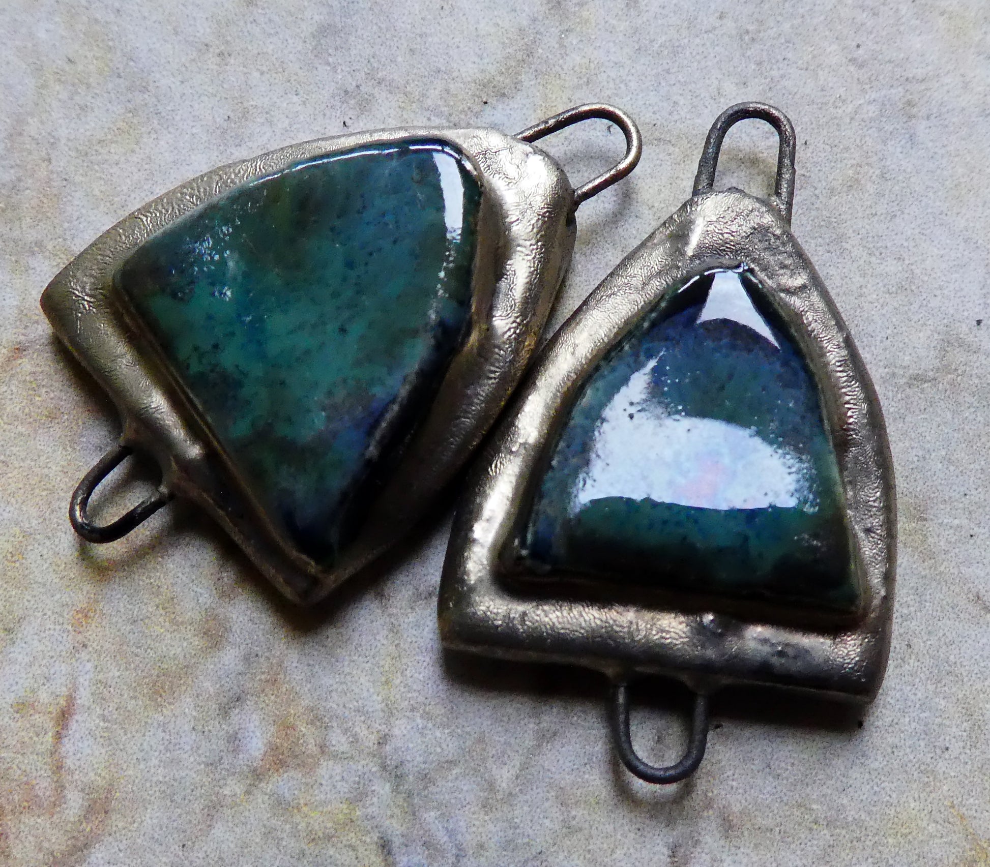 Hand formed in Earthstone and high fired. Then fired again with bronze clay and Obsidian glaze.