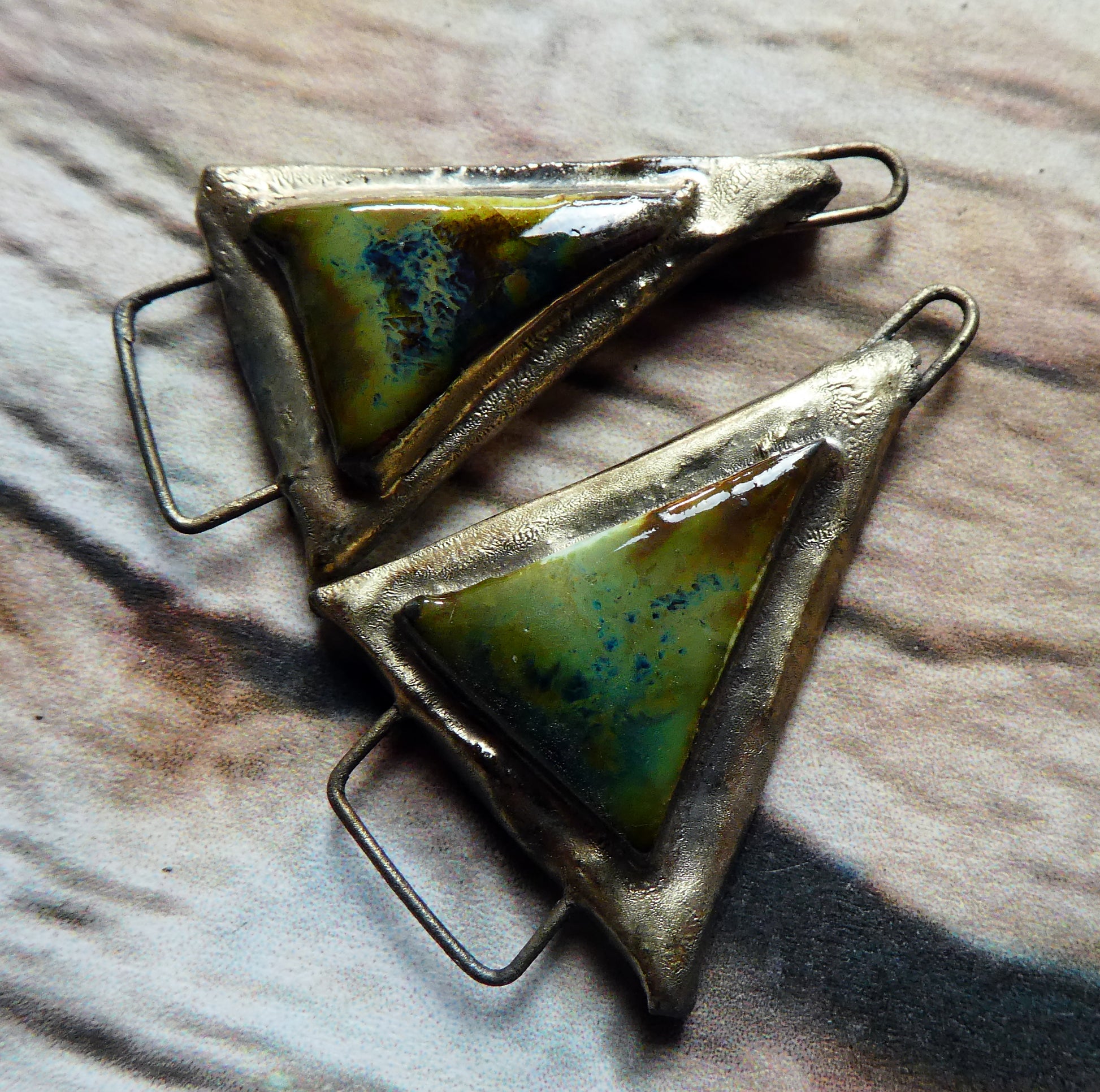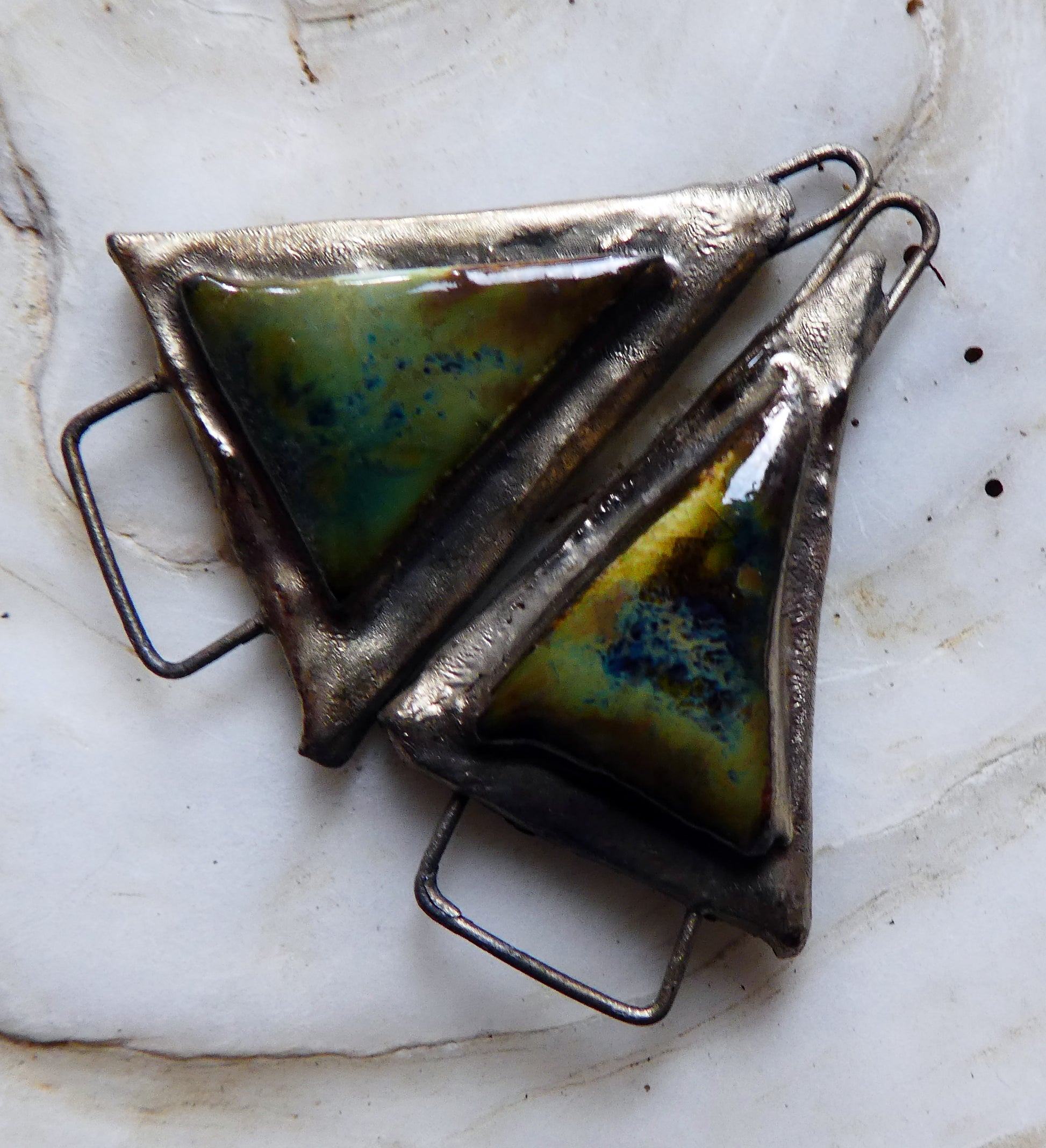 Hand formed in Earthstone and high fired. Then fired again with bronze clay and Pagoda glaze.