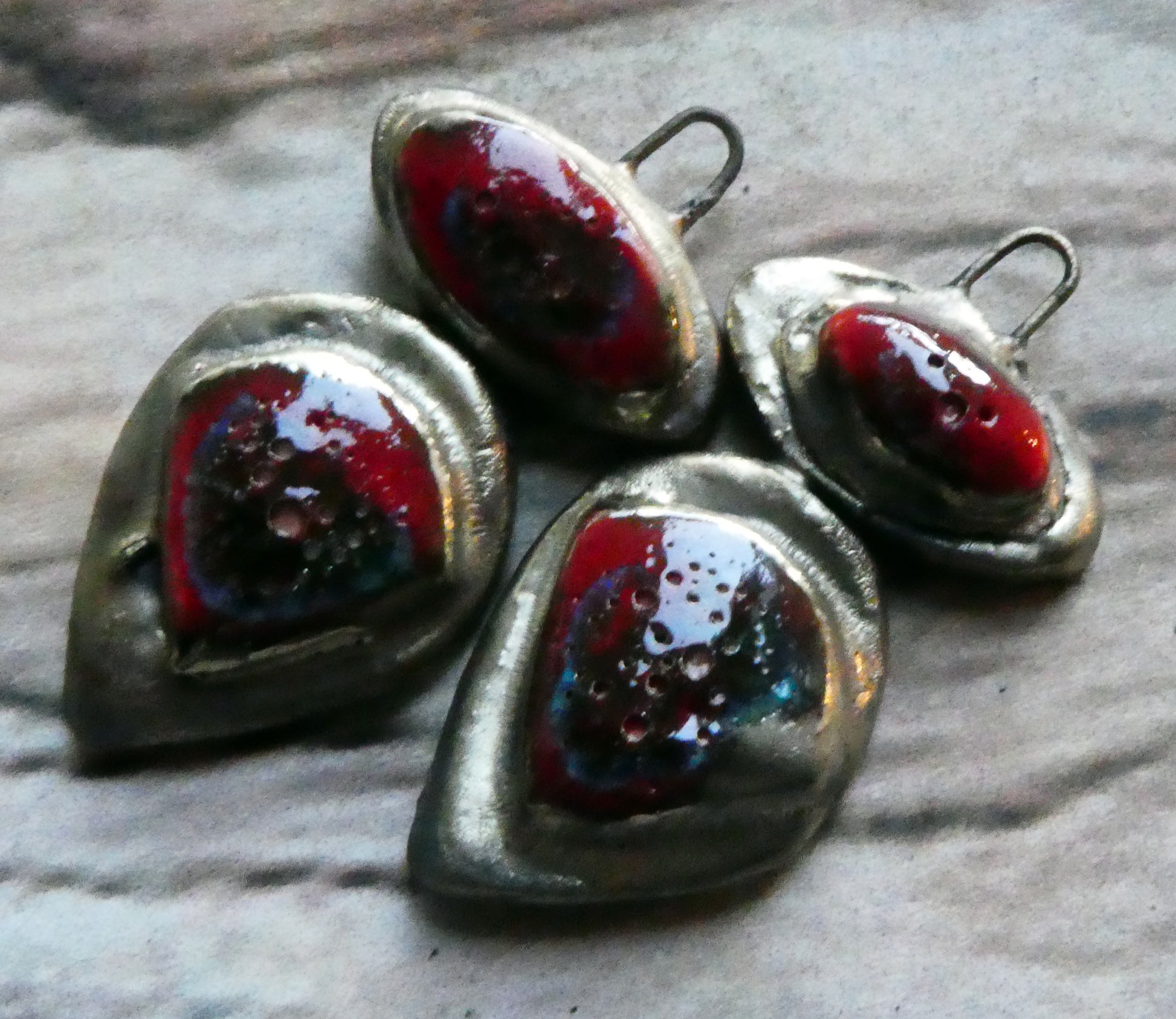 Hand formed in Earthstone and high fired. Then fired again with bronze clay and Ladybird glaze.