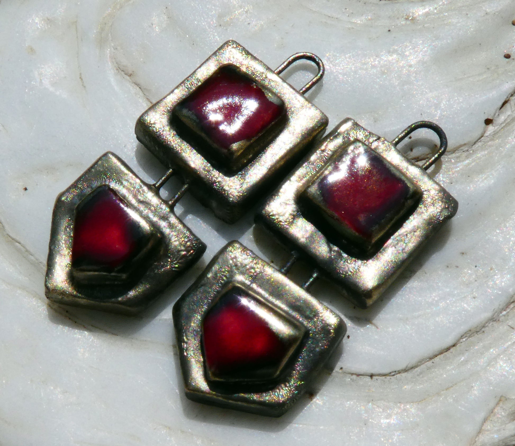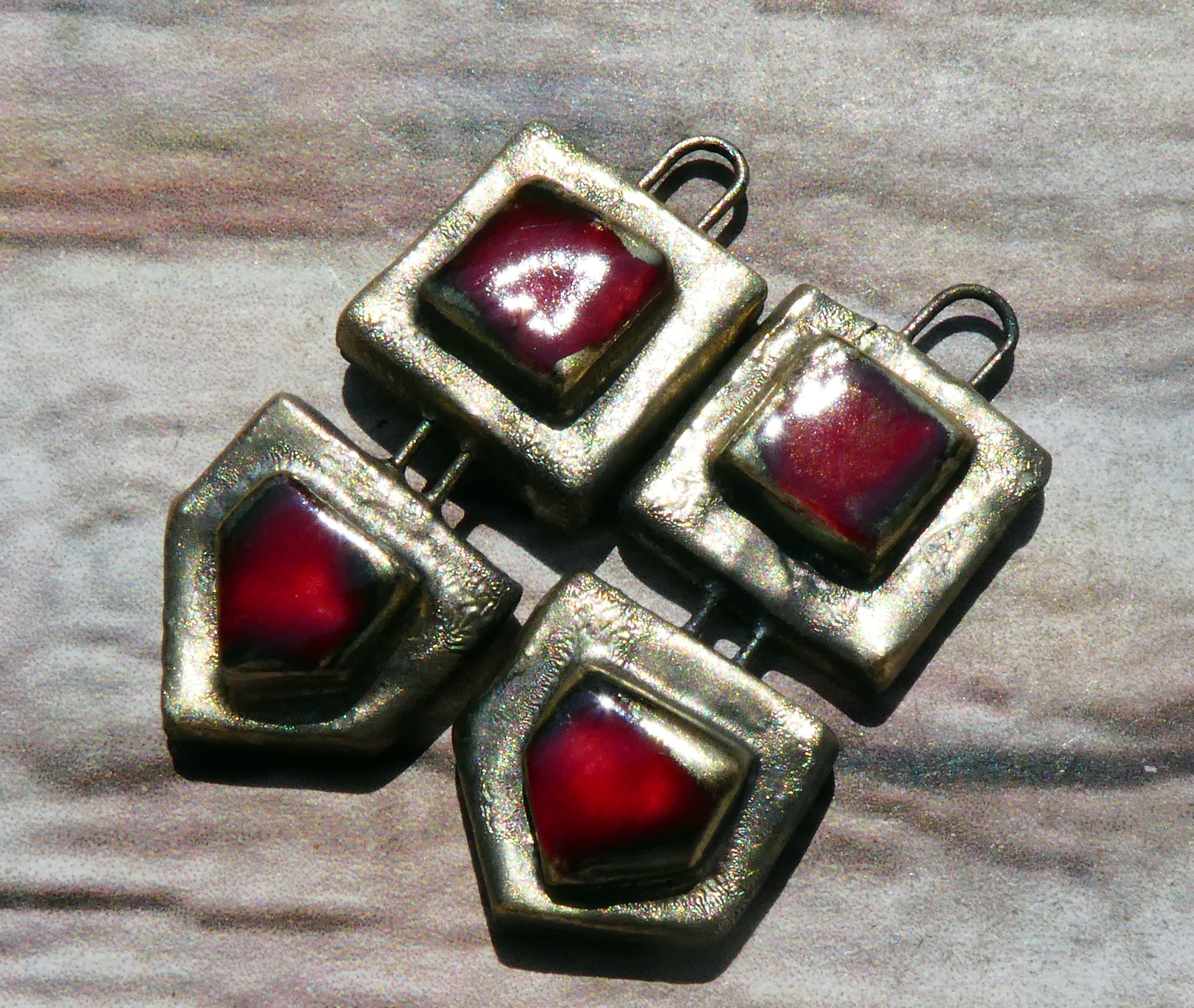 Hand formed in Earthstone and high fired. Then fired again with bronze clay and Red glaze.