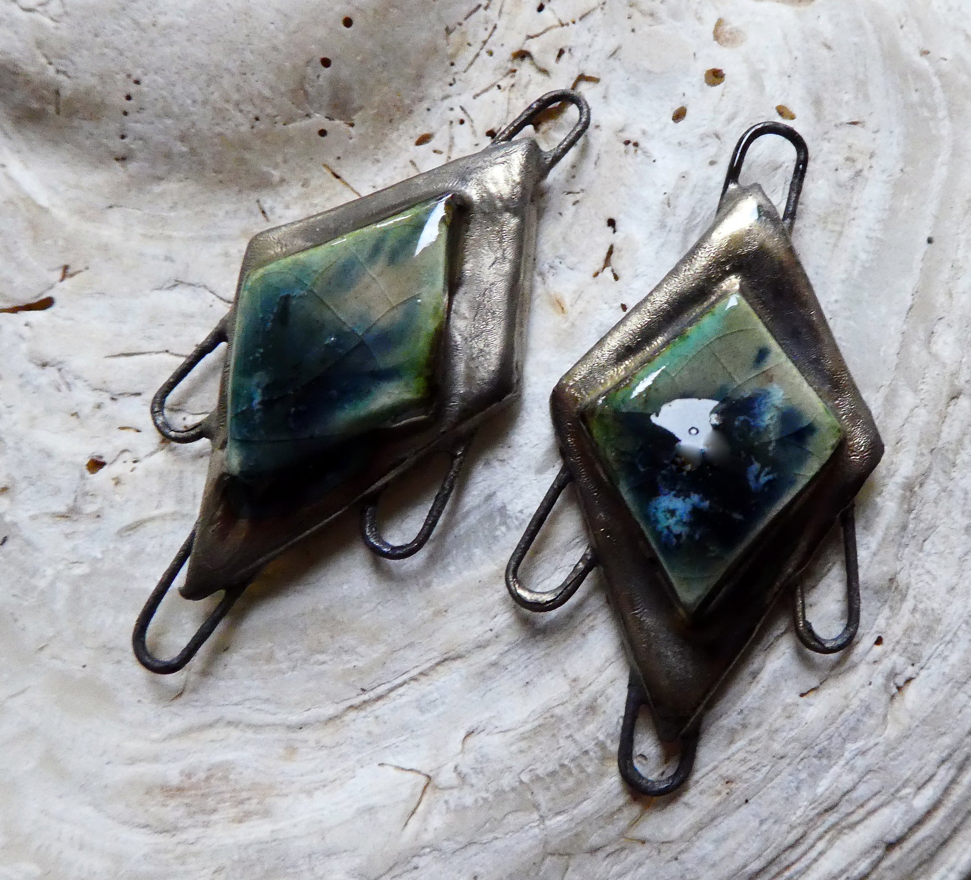 Hand formed in Earthstone and high fired. Then fired again with bronze clay and Sea Urchin glaze.