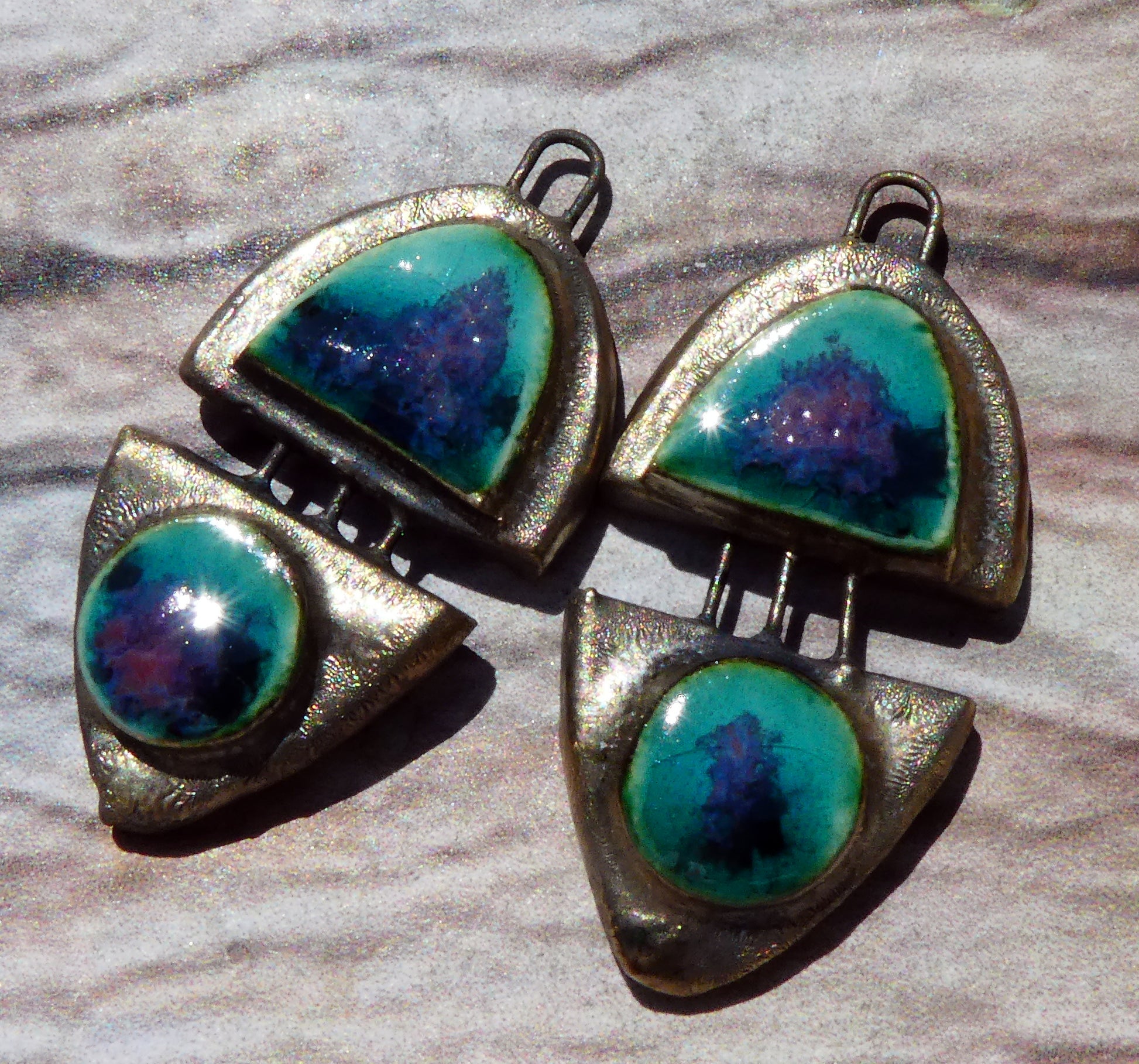 Hand formed in Earthstone and high fired. Then fired again with bronze clay and Spring Meadow glaze.