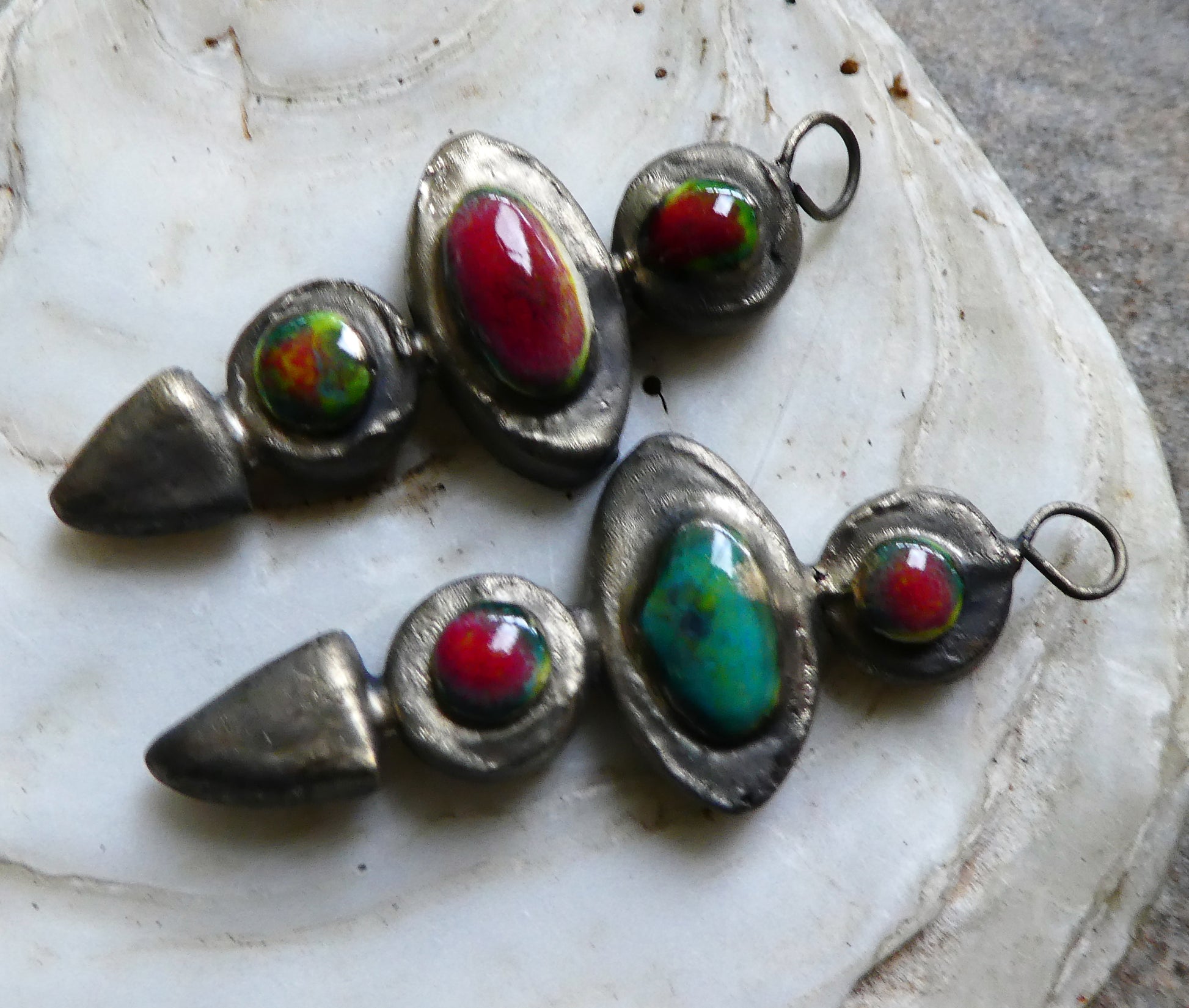Hand formed in Earthstone and high fired. Then fired again with bronze clay and Cherry Limeade glaze.