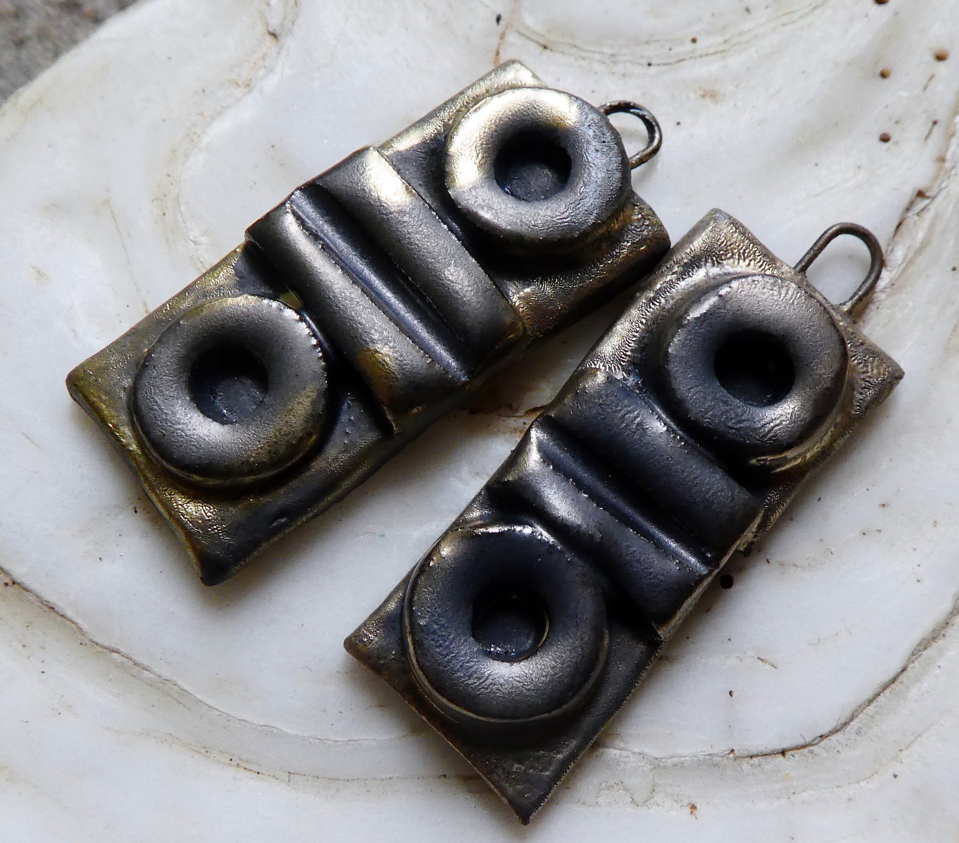 A pair of moulded tablet charms.
