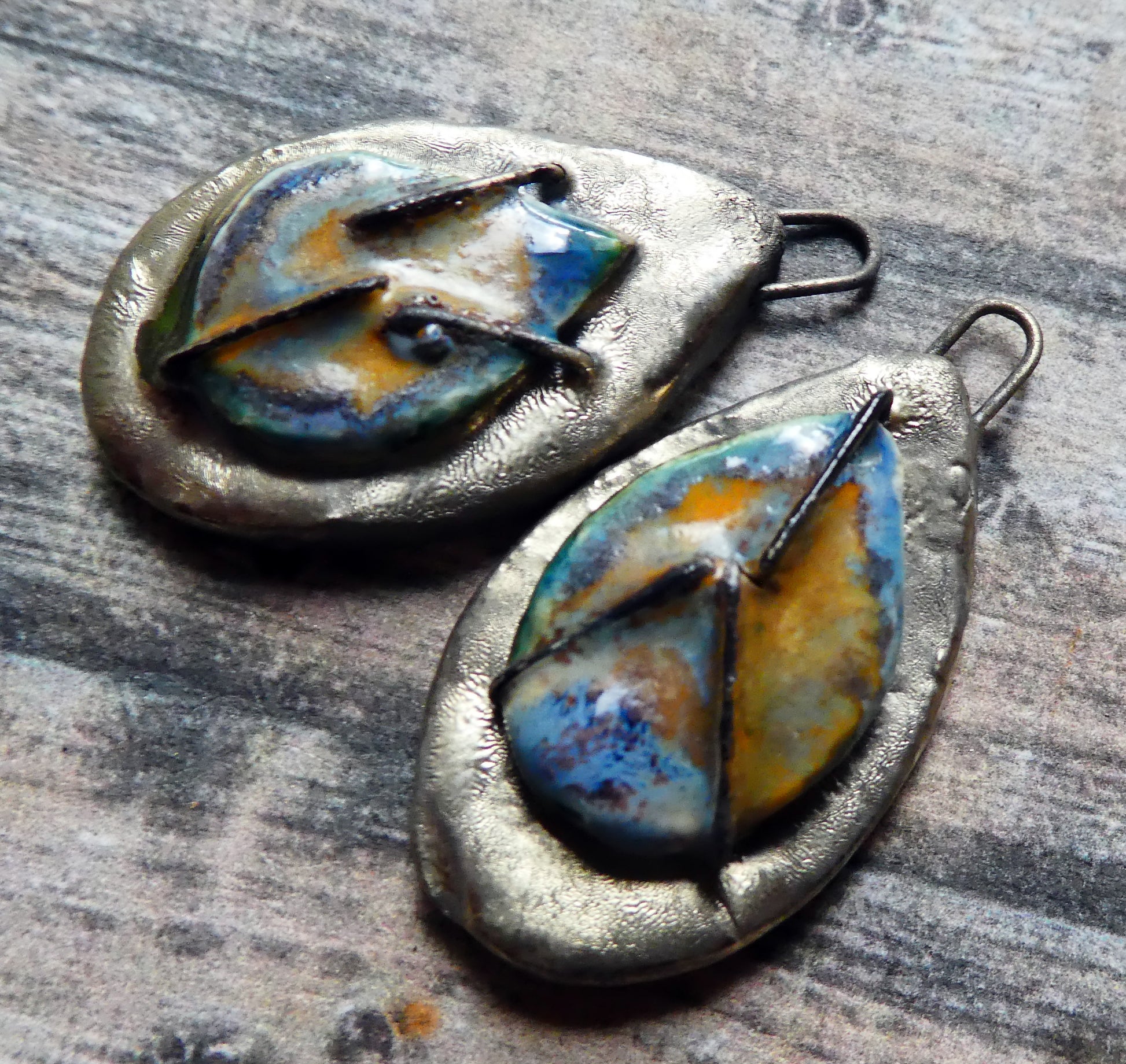 Hand formed in Earthstone and high fired with embedded staples. Then fired again with bronze clay and Outer Space glaze.