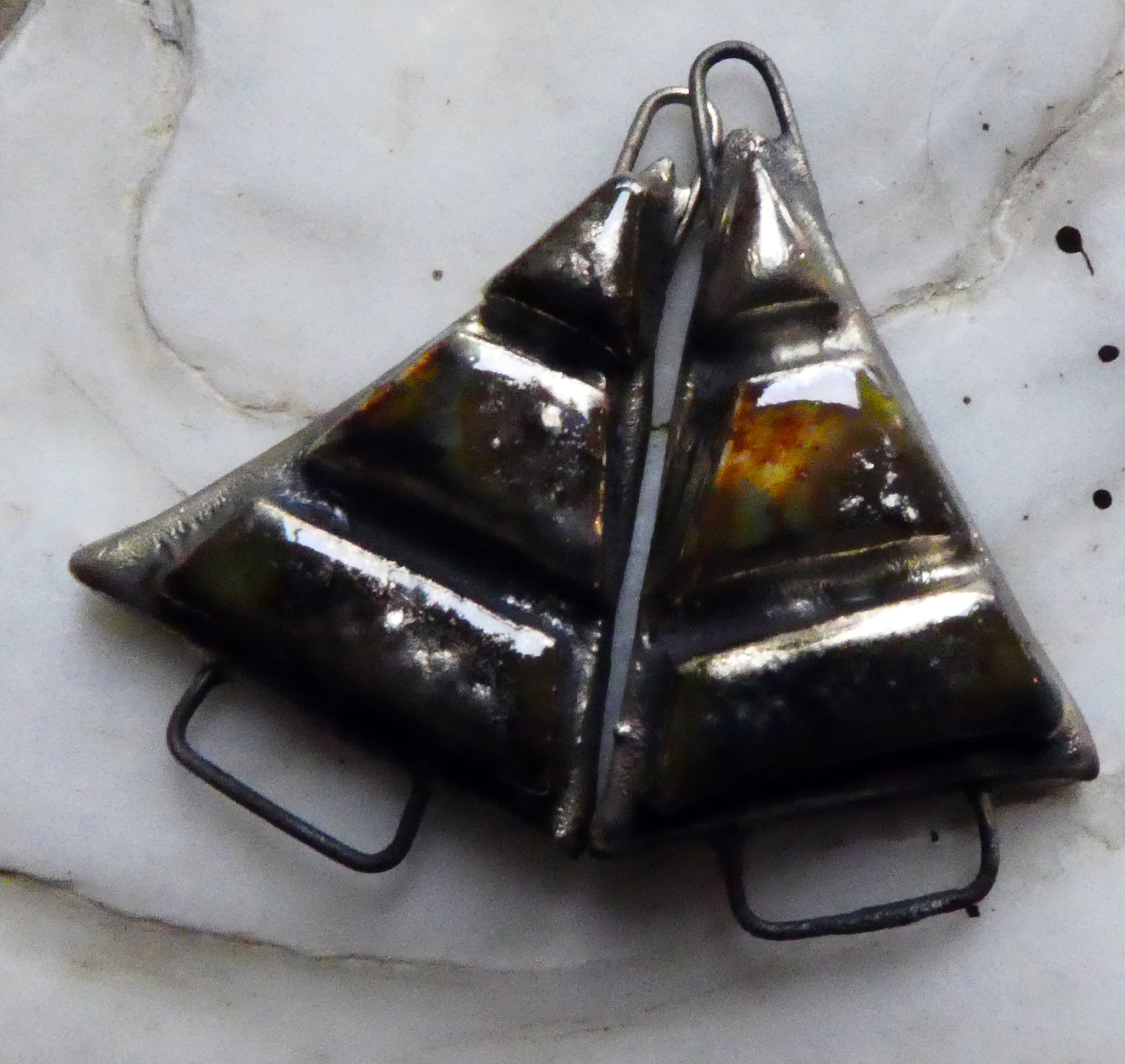 Hand formed in Earthstone and high fired. Then fired again with bronze clay and Pagoda glaze.