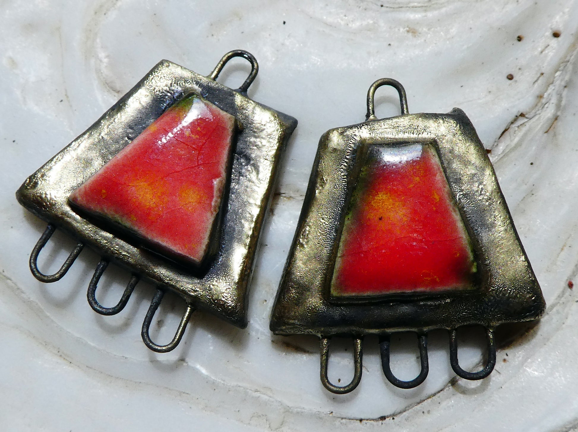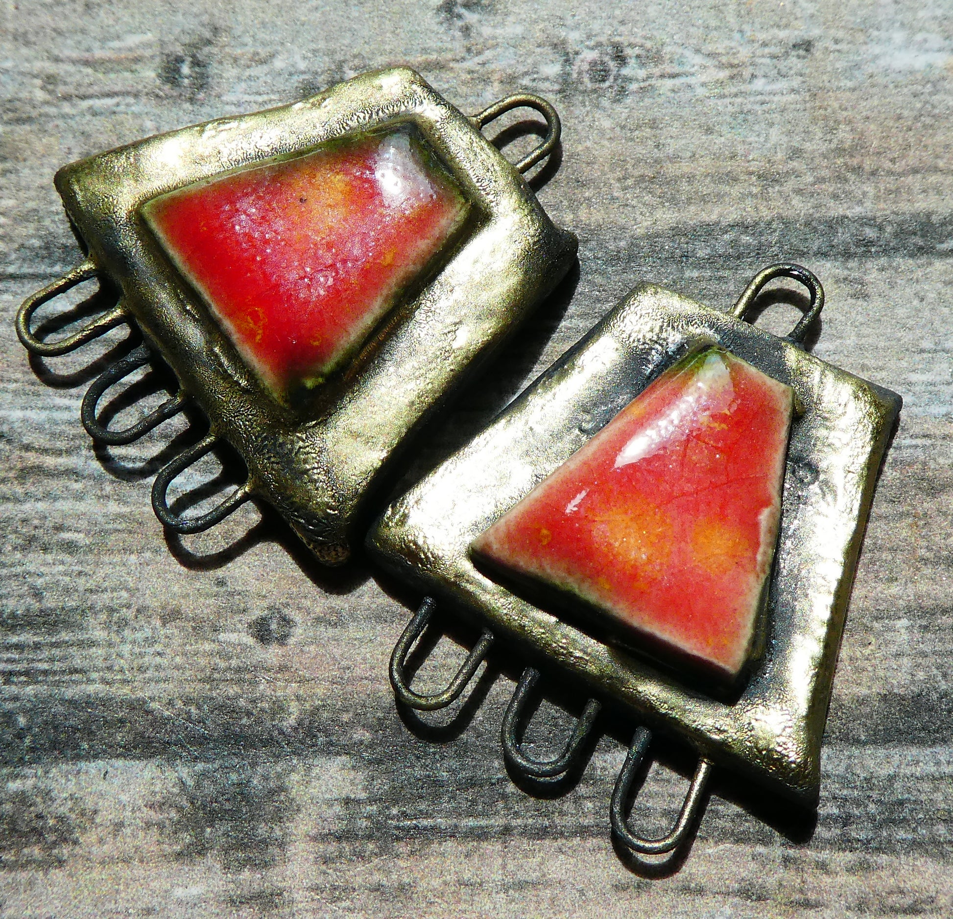 Hand formed in Earthstone and high fired. Then fired again with bronze clay and Fruit Punch glaze.