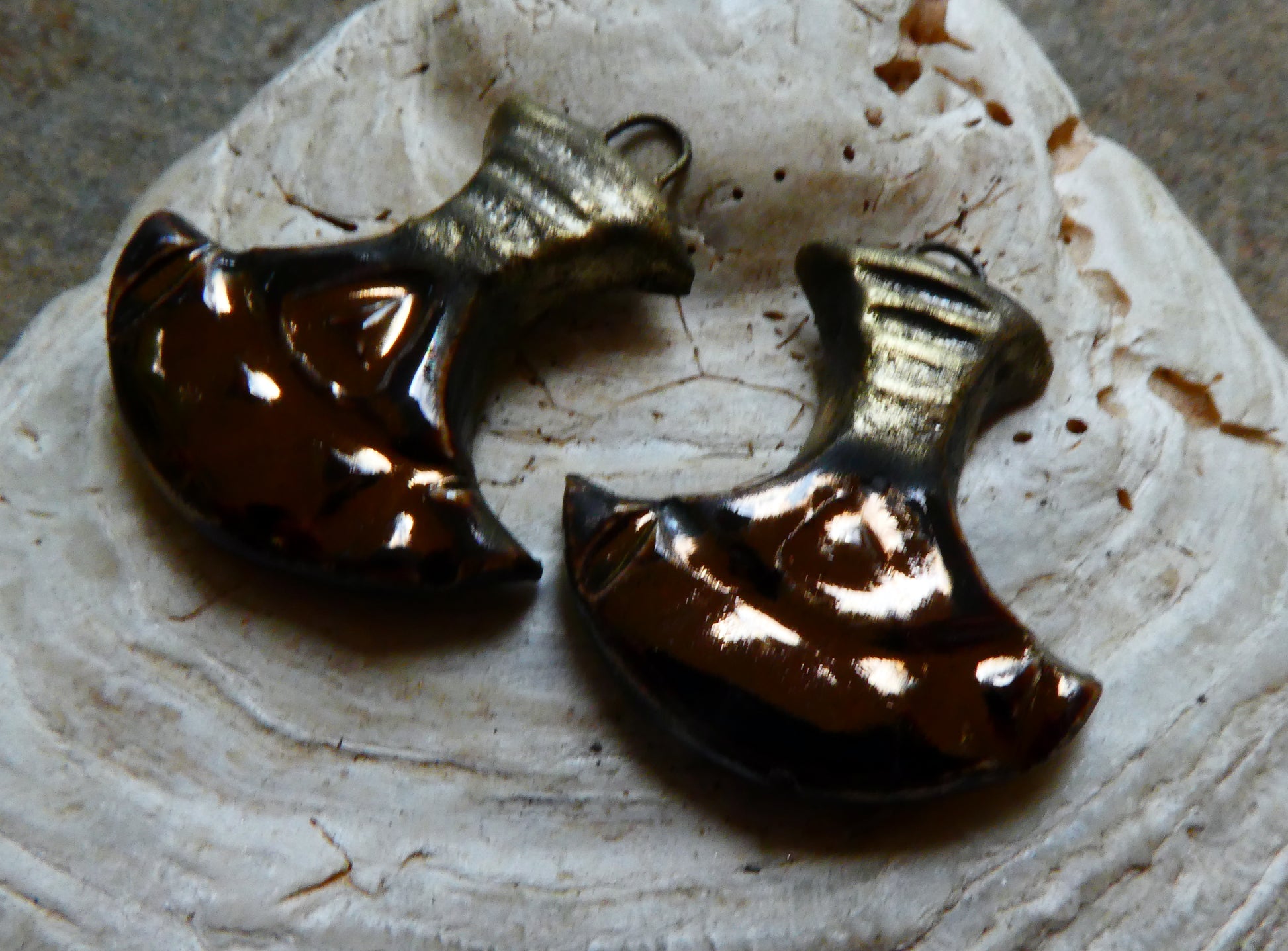 Hand formed in Earthstone, high fired. Fired again with bronze clay and Glossy Gold glaze.