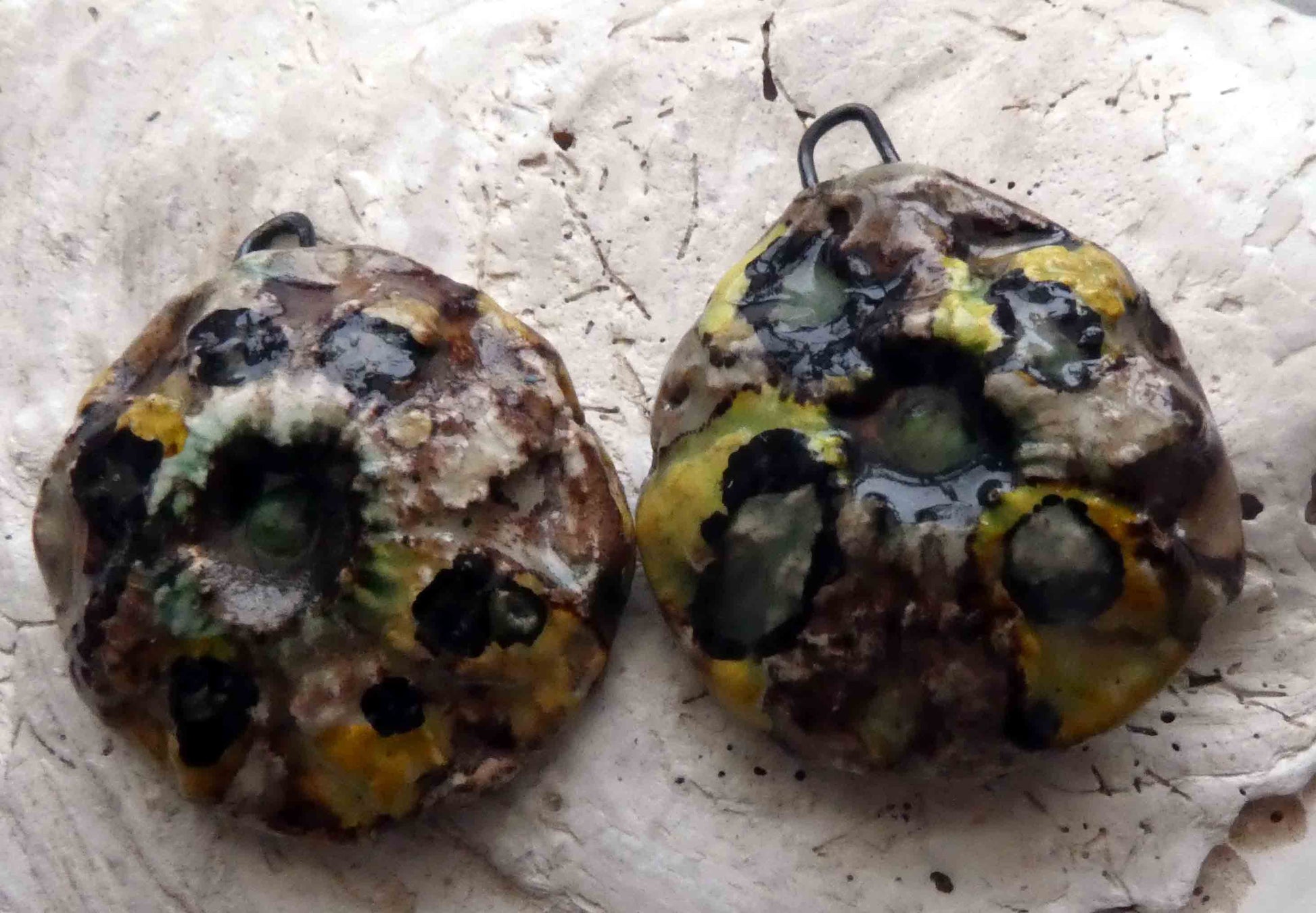 Hand formed in Earthstone, textured with organic moulds and high fired. Then fired again with matte glaze. Applied with layers of mixed brown alcohol inks. Low fired to set the colours, then applied with lacquer and low fire again to a satiny finish. Reversible.