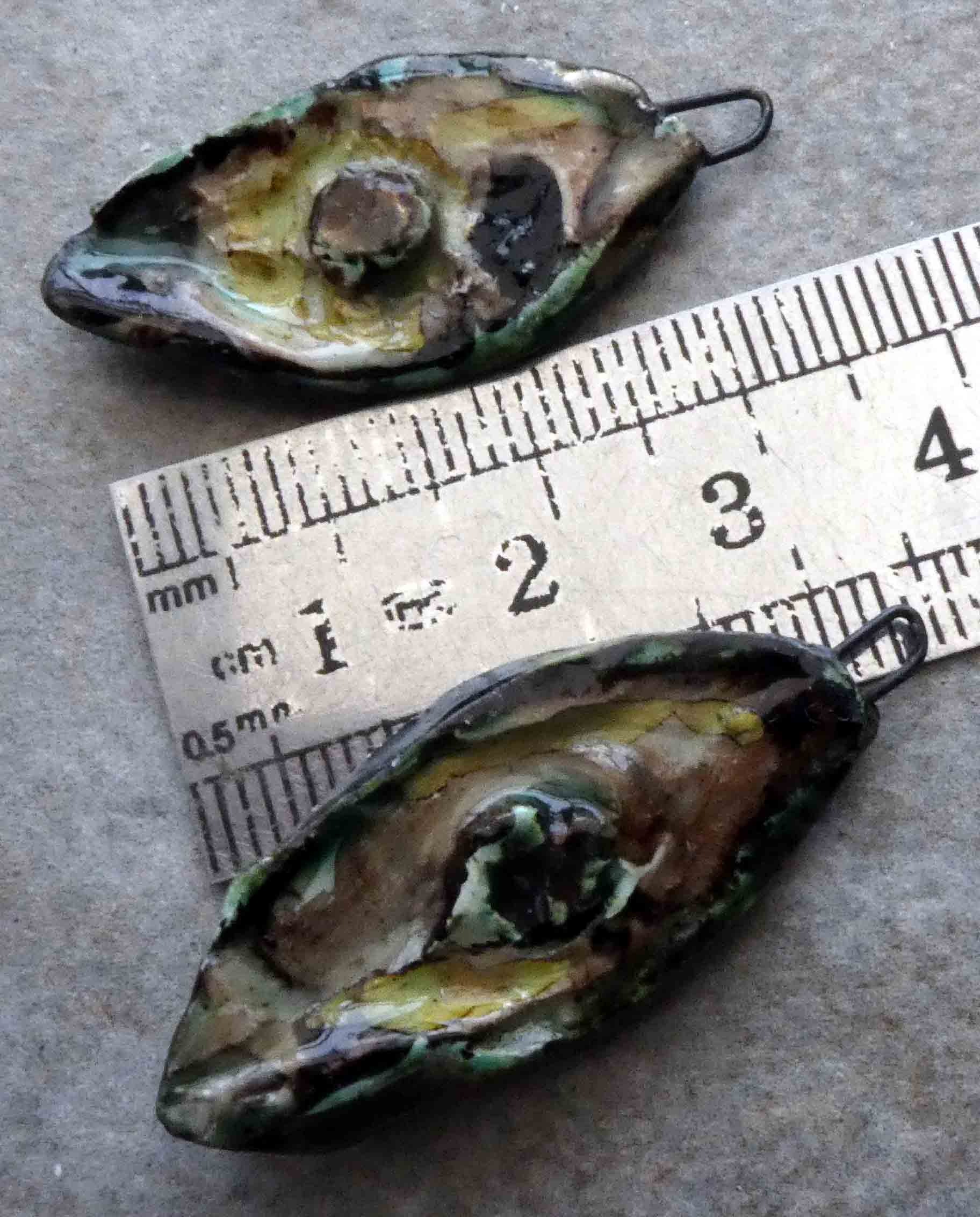 Hand formed in Earthstone, textured with organic moulds and high fired. Then fired again with gloss glaze. Applied with layers of mixed brown and black alcohol inks. Low fired to set the colours, then applied with lacquer and low fire again to a glossy finish. Reversible.