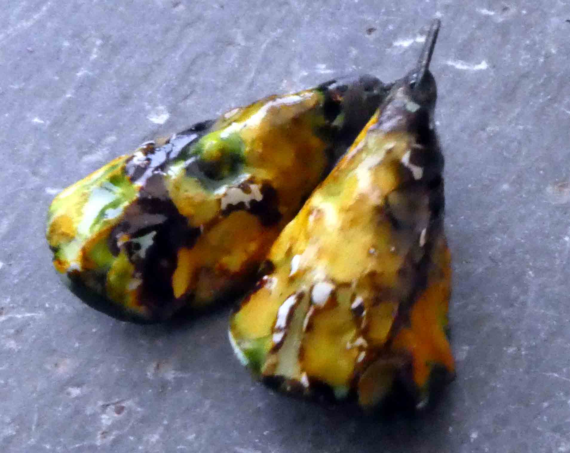Hand formed in Earthstone, textured with organic moulds and high fired. Then fired again with gloss glaze. Applied with layers of mixed alcohol inks. Low fired to set the colours, then applied with lacquer and low fire again to a glossy finish. Reversible.