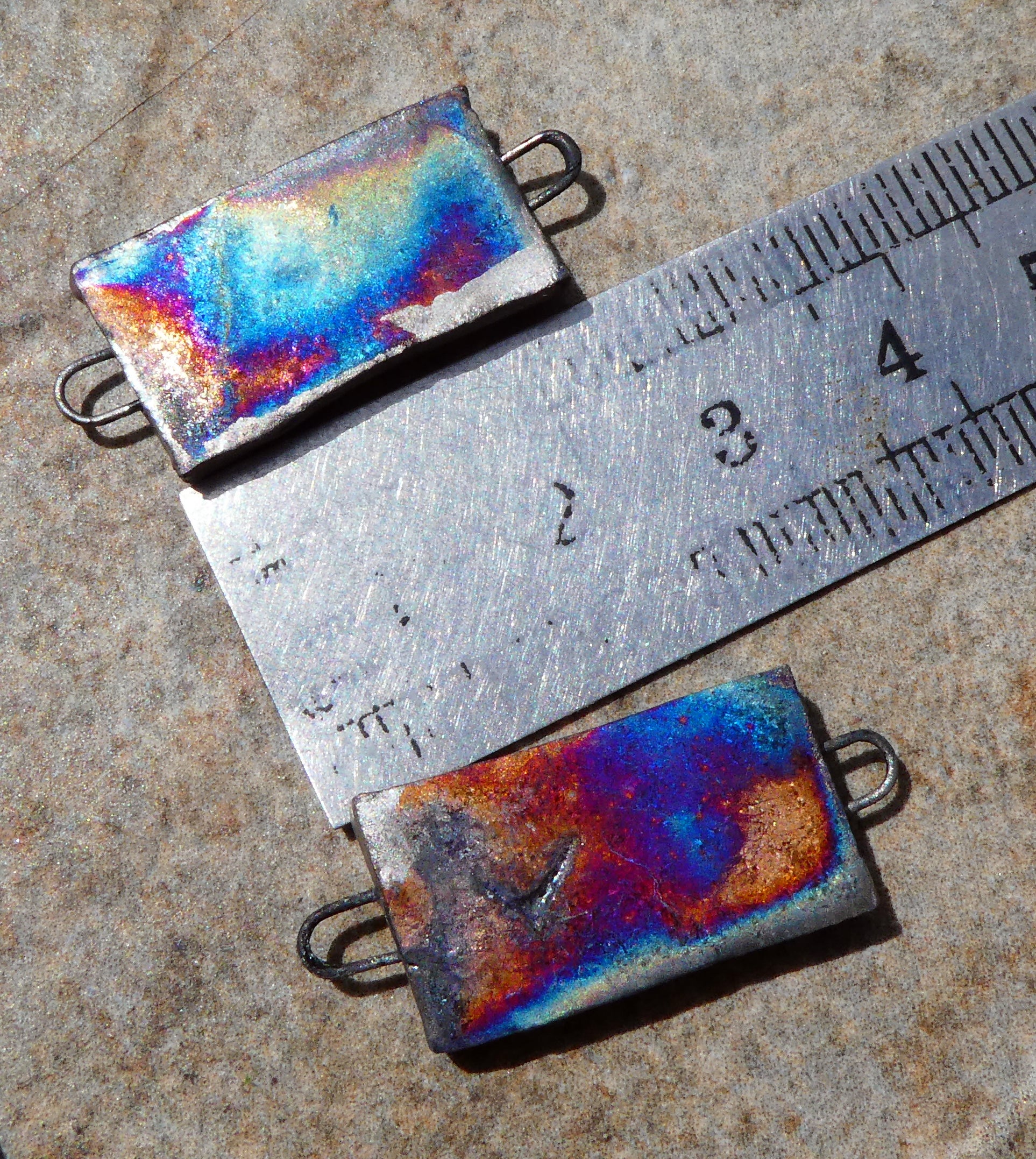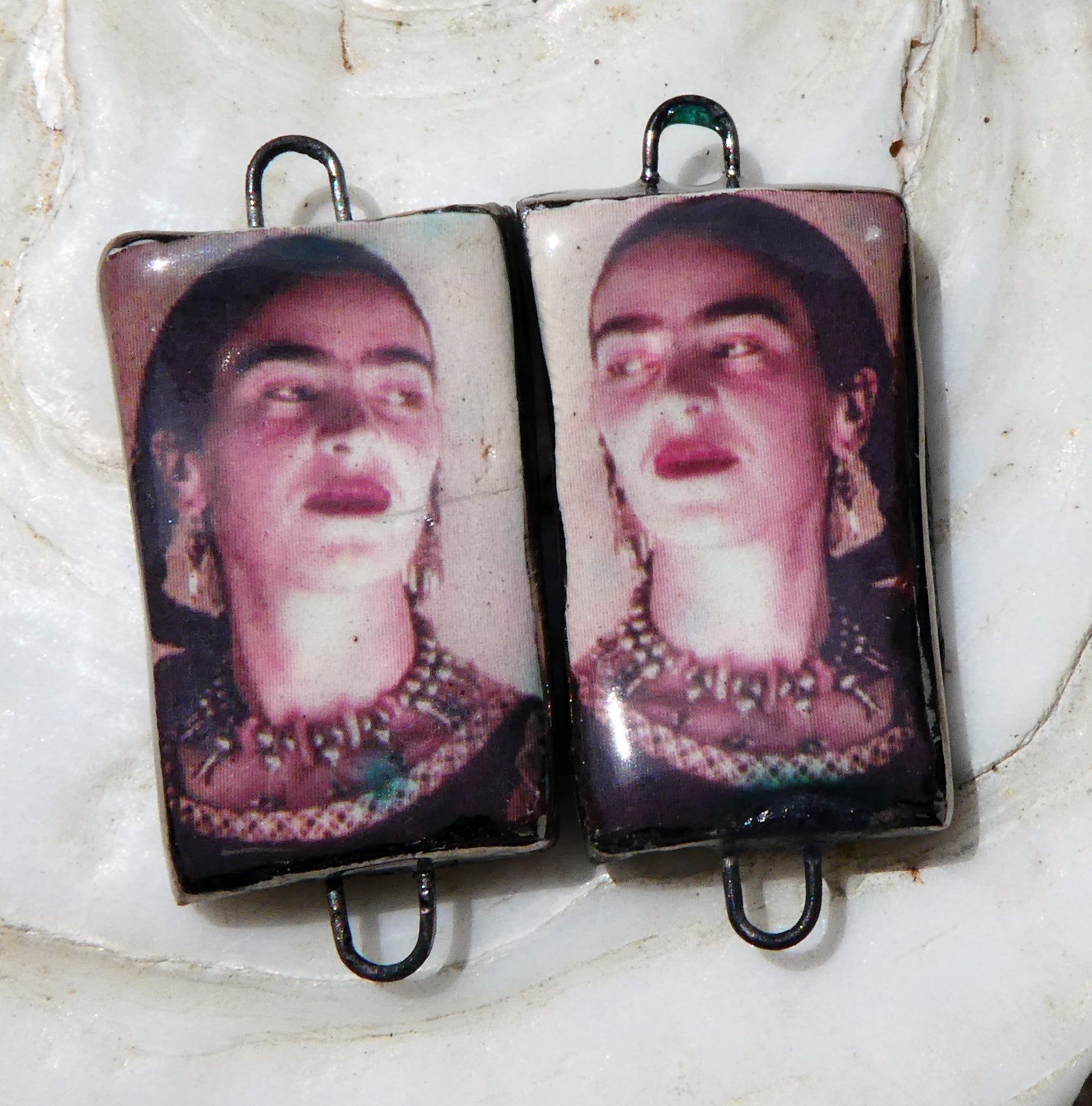 Hand formed in Earthstone and high fired. Then fired again with bronze clay and gloss glaze. Applied with Frida decals and fired again. Then fired once more with lustre. Scorched on the backs to a rainbow finish.