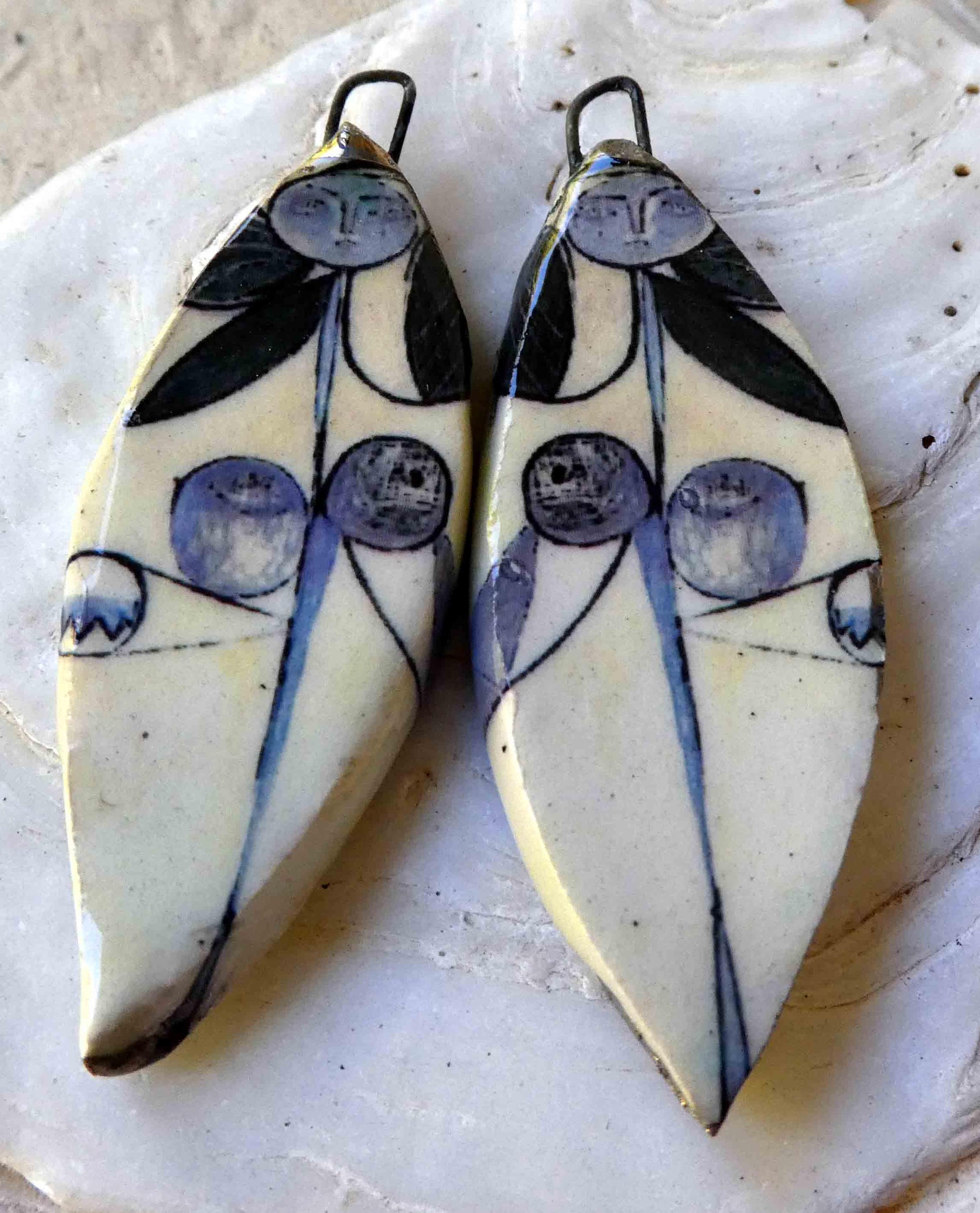 A pair of lightweight droppers. Hand formed droppers, fired with gloss glaze. Then applied with Picasso ceramic decals and fired again with Platinum Lustre.Scorched on the backs to a rainbow finish. ©ScorchedEarthDesigns